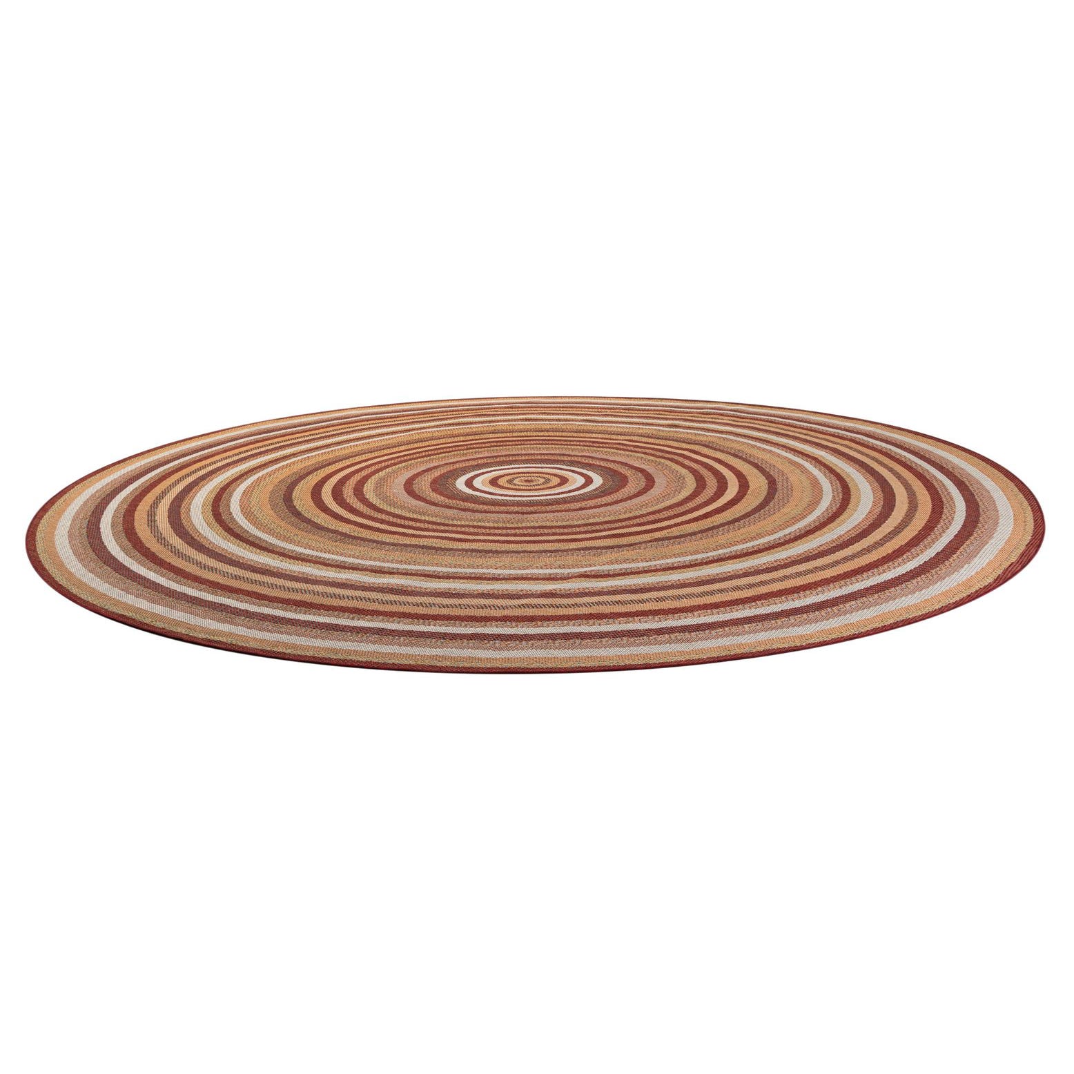 A 12-foot round Baja Outdoor rug by Rugs.com with concentric stripes in varying shades of red, orange, and cream.