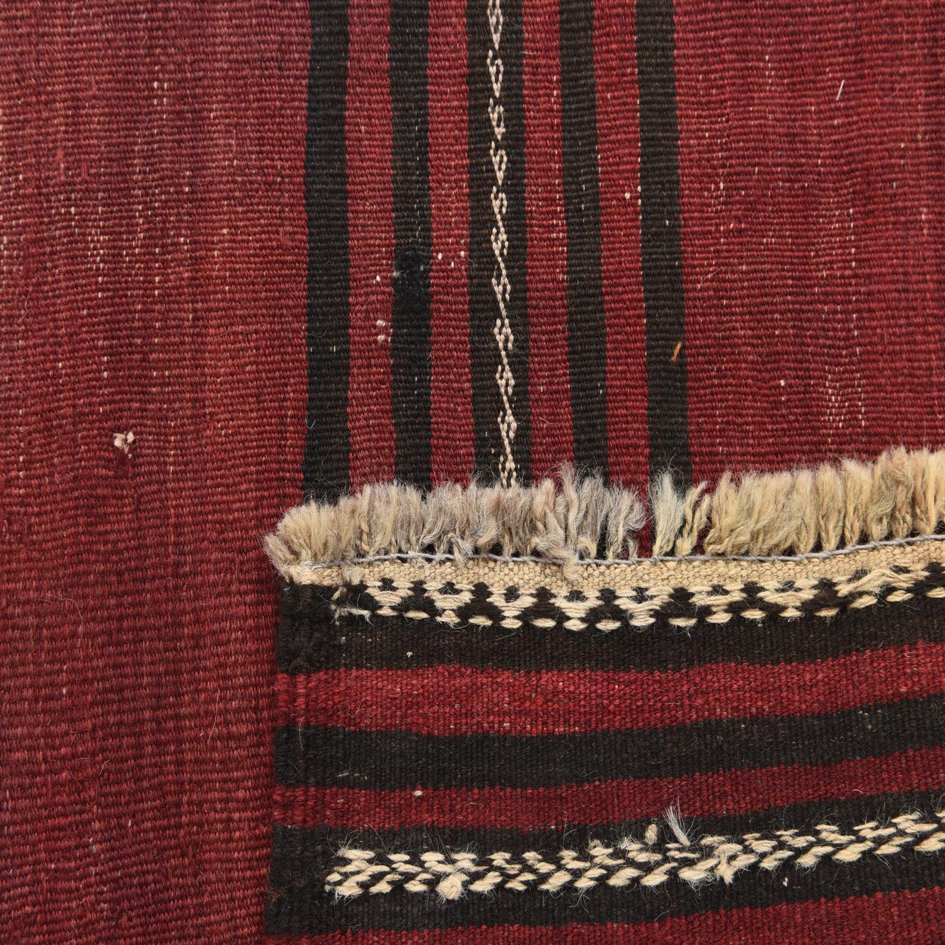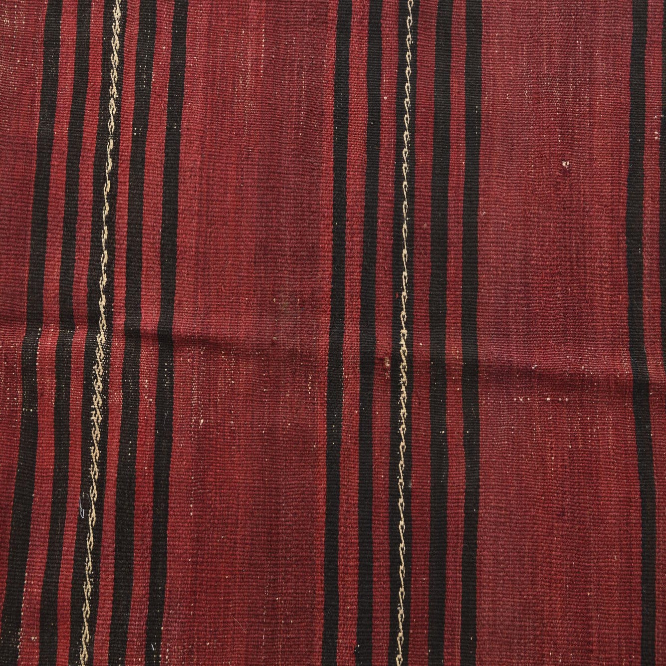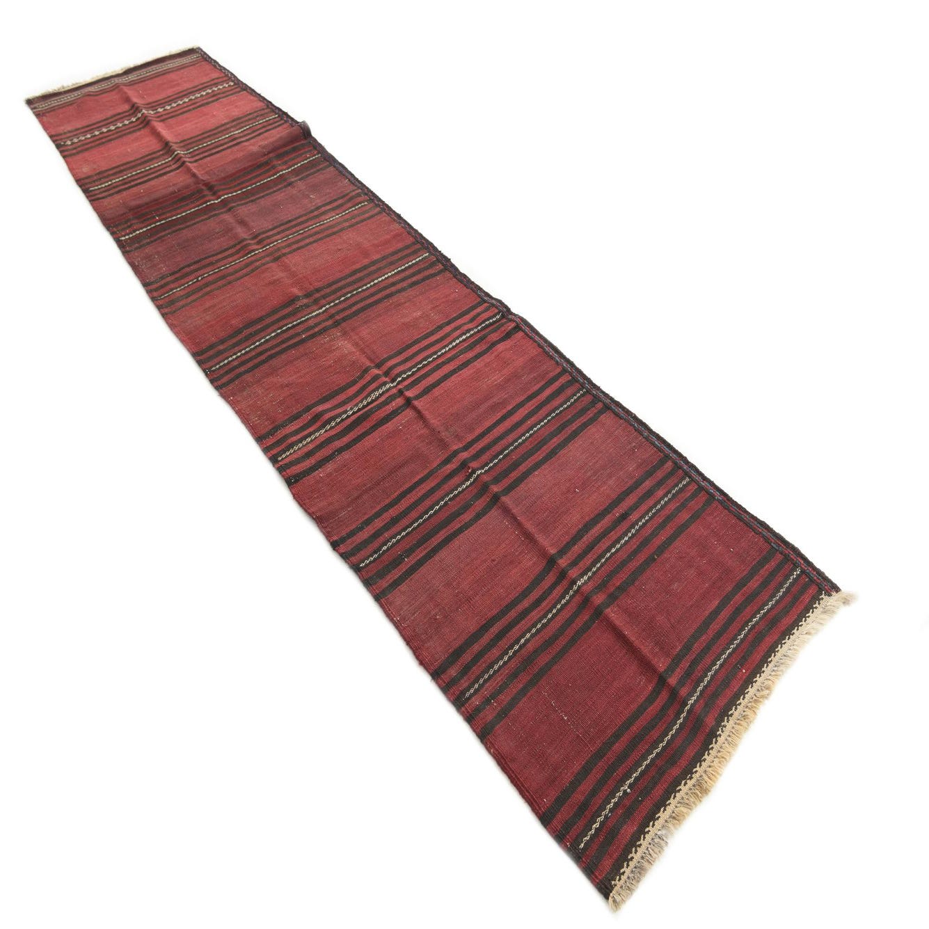 A 12 ft runner rug with a tribal stripe pattern in varying shades of red and black, with thin white accents.