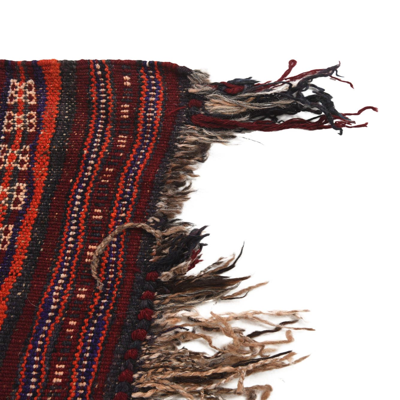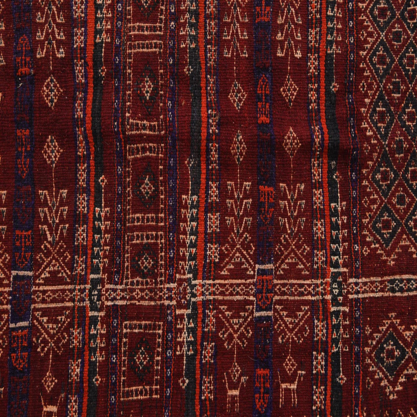 Primary color is Burgundy. Colors in this rug include: Burgundy, Black, Brown, Navy Blue, Orange, Green, Ivory.