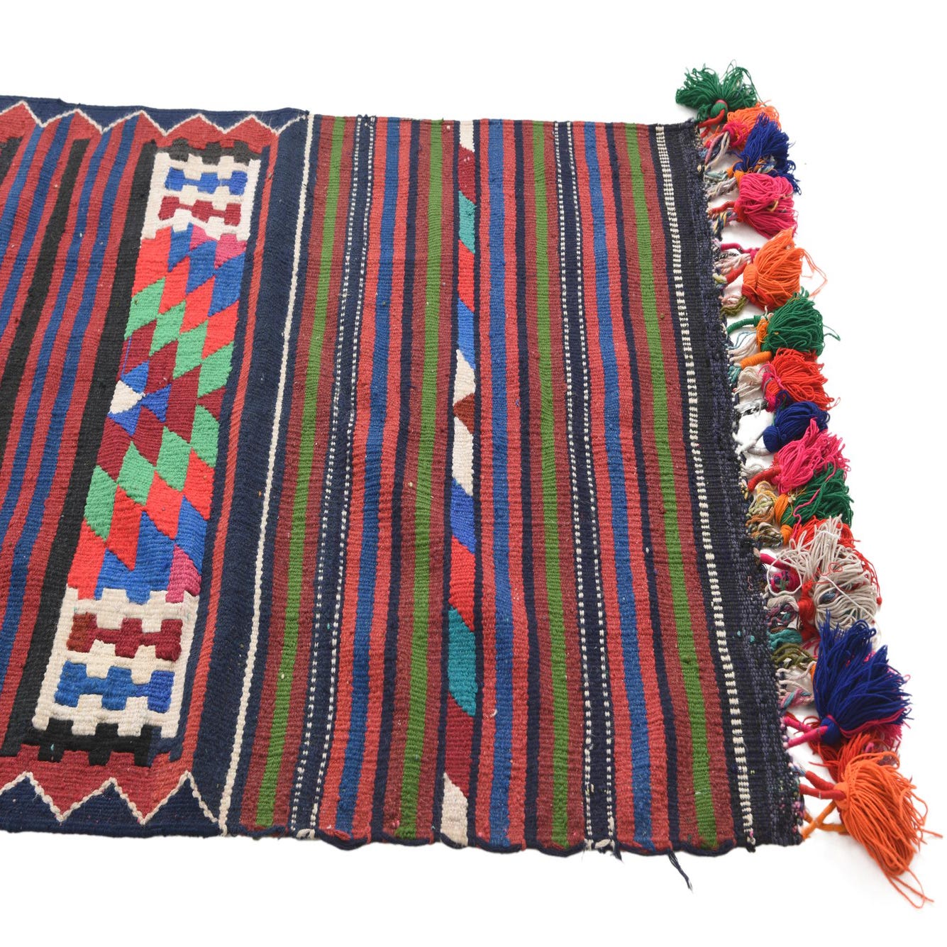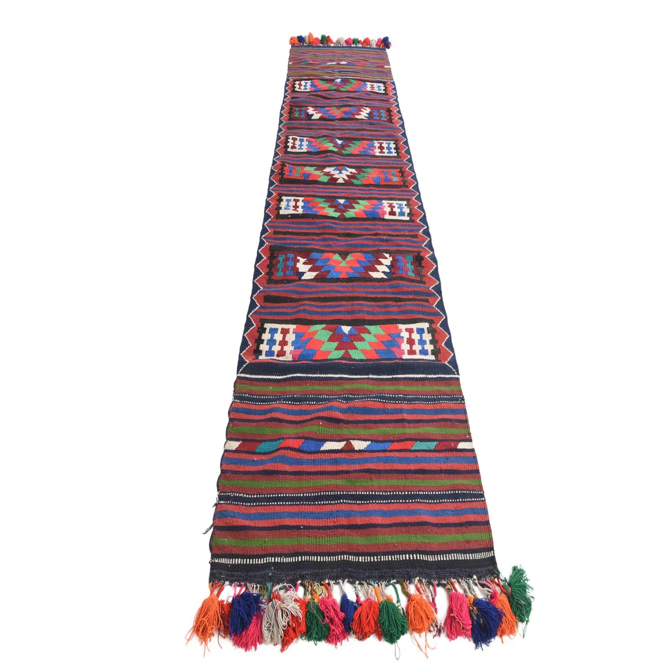 A vibrant 12 ft Kilim Fars runner rug with red, blue, green, and black stripes, tribal patterns, and colorful tassels.