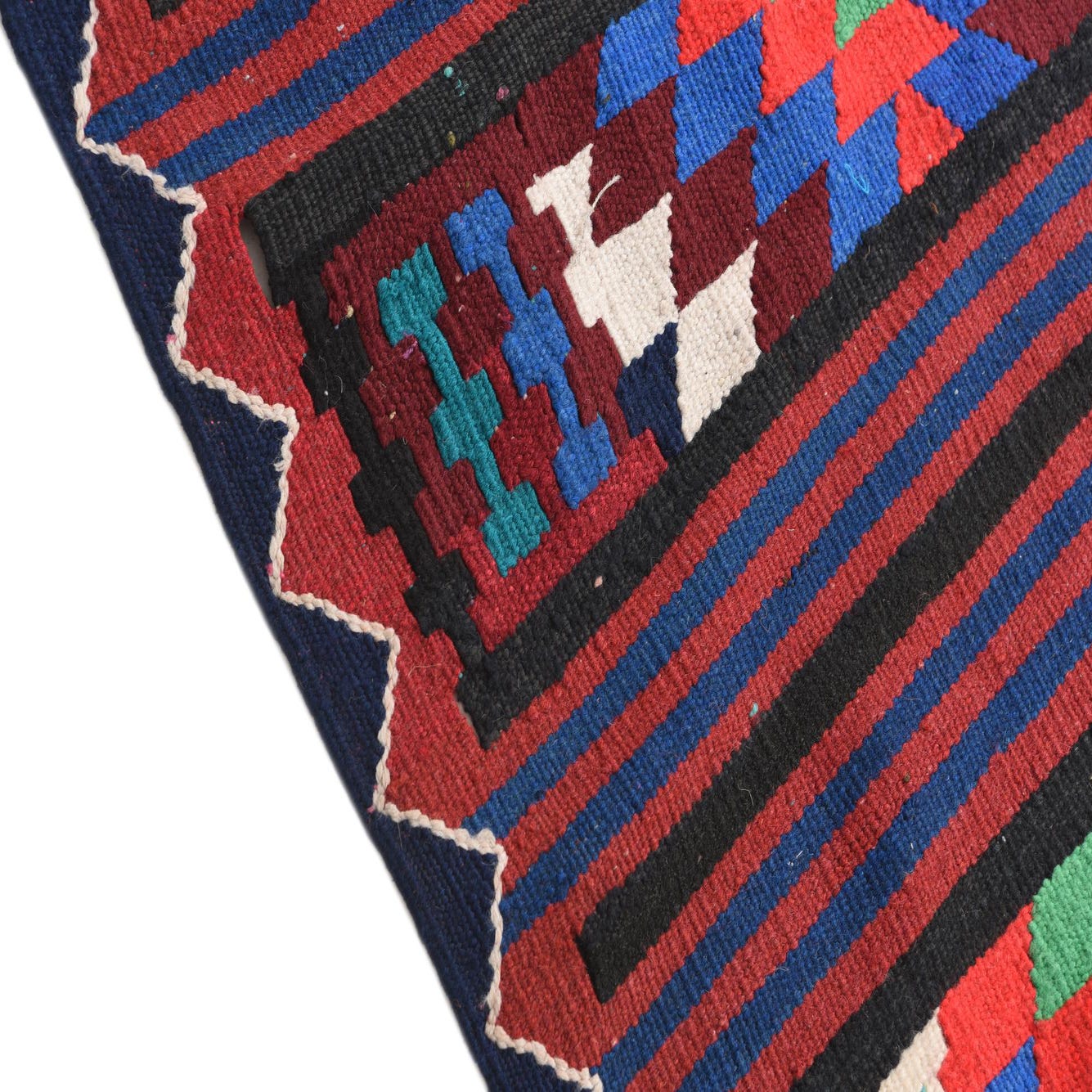 The Kilim Fars collection presents a 12 Ft Runner rug that is a testament to traditional craftsmanship. Handwoven of 100% wool, the rug exudes durability and a tactile surface texture indicative of its high-quality material. Its burgundy background sets a warm and inviting tone, complemented by a vibrant pattern incorporating black, blue, brown, green, ivory, navy blue, and red hues. The design boasts geometric motifs and stripes, creating a visual rhythm and tribal aesthetic.