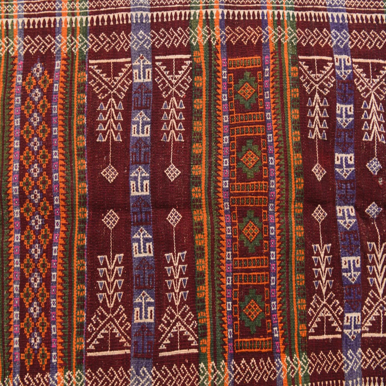 The flatweave texture of this runner offers a durable and versatile surface, making it suitable for high-traffic areas, while its slender profile allows it to fit seamlessly into narrow spaces such as hallways or alongside a kitchen island. Despite its missing fringe and repair marks, this semi-antique rug showcases character that complements eclectic, bohemian, and traditional interiors. It is ideal for those appreciating historic craftsmanship and cultural storytelling within their home decor.