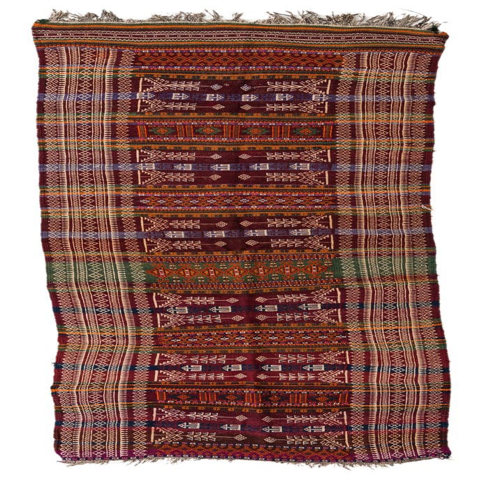 The Kilim Fars collection presents this handwoven 100% wool 12 ft runner, boasting a tapestry of rich colors and intricate patterns that imbue a sense of timeless tradition. The dominant burgundy background creates a warm foundation for the geometric symmetry and tribal motifs featured throughout the design. Accent hues including brown, ivory, navy blue, orange, green, and violet add visual depth to the pattern, enhancing its textural richness and artisanal appeal.