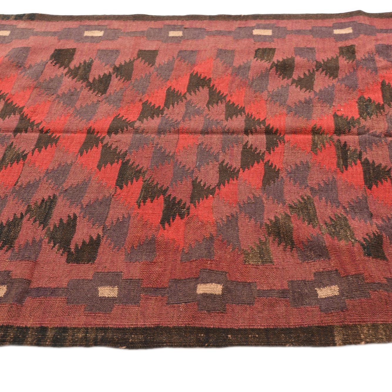 Primary color is Burgundy. Colors in this rug include: Burgundy, Brown, Ivory, Red, Black.