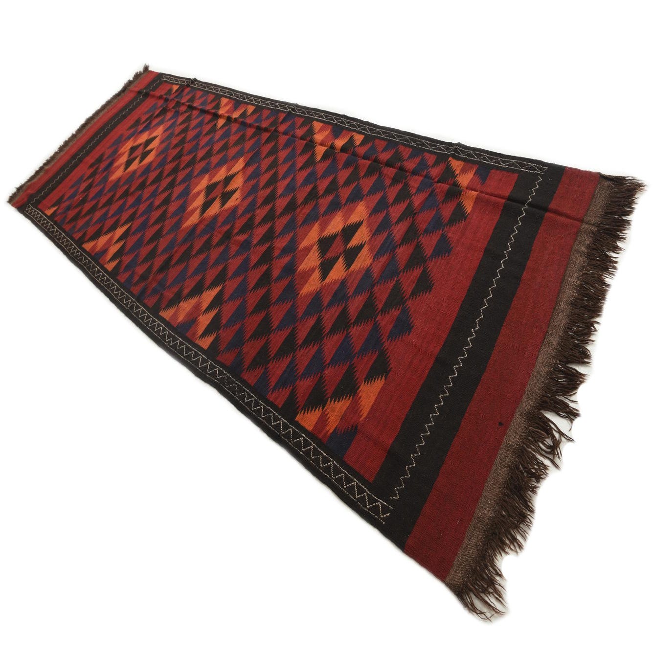 The Kilim Fars 12 Ft Runner is a handwoven rug crafted from 100% wool, providing both durability and a tactile, inviting texture underfoot. The rug’s design showcases a distinctive geometric pattern with bold, angular motifs that imbue it with a sense of movement and visual interest. The color palette is rich and warm, grounded by a burgundy background with contrasting patterns in black, brown, orange, and navy blue. Noteworthy is the presence of fringes on its ends, adding to its handcrafted appeal.