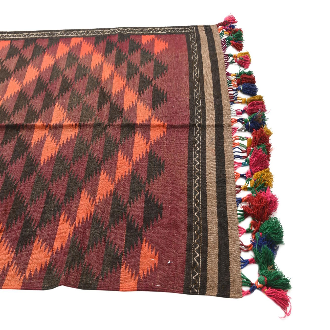A 12 ft Kilim Fars runner rug with a tribal geometric pattern in shades of red, orange, and black, featuring colorful tassels.