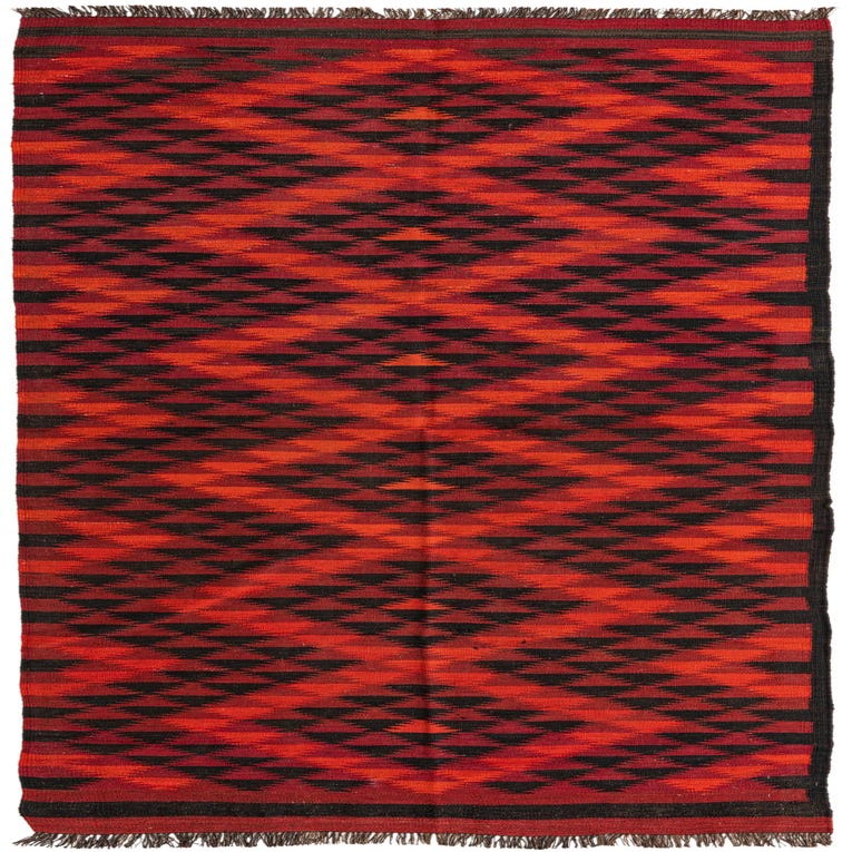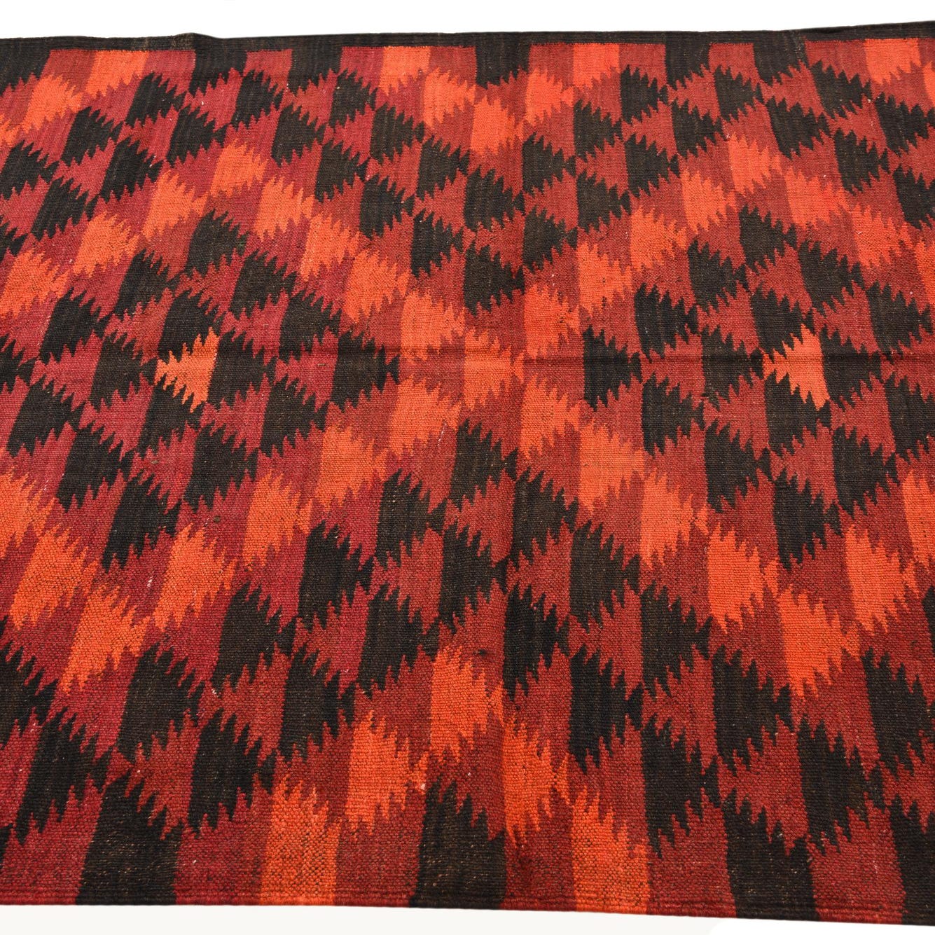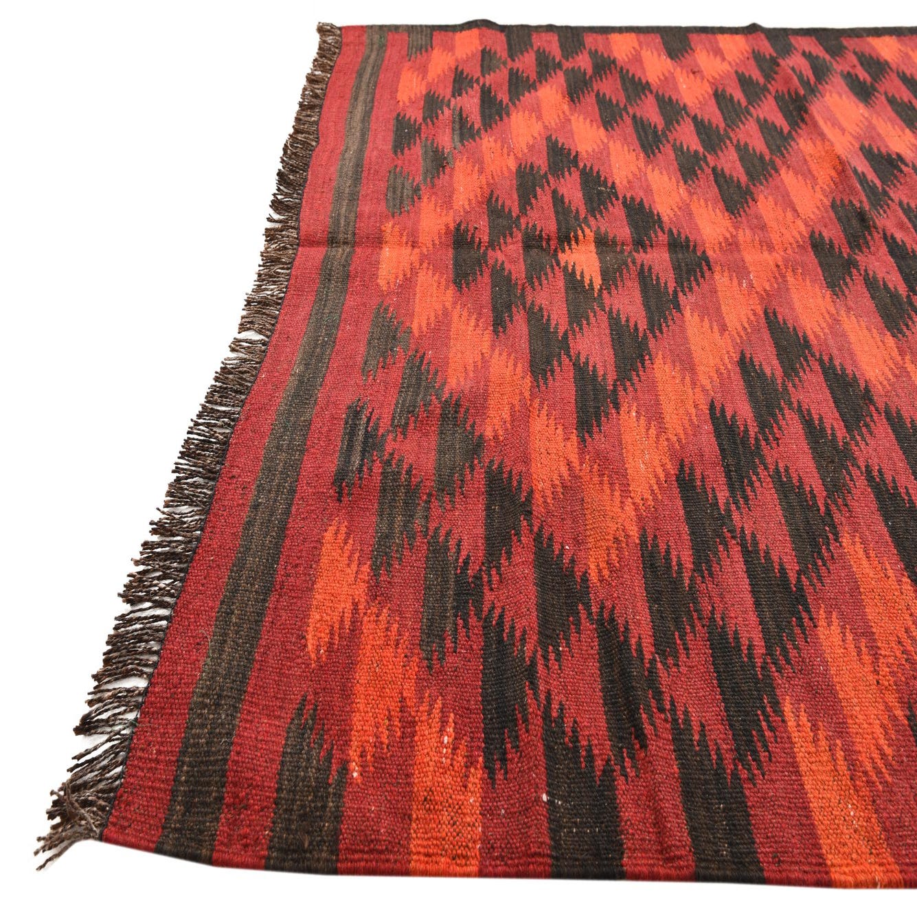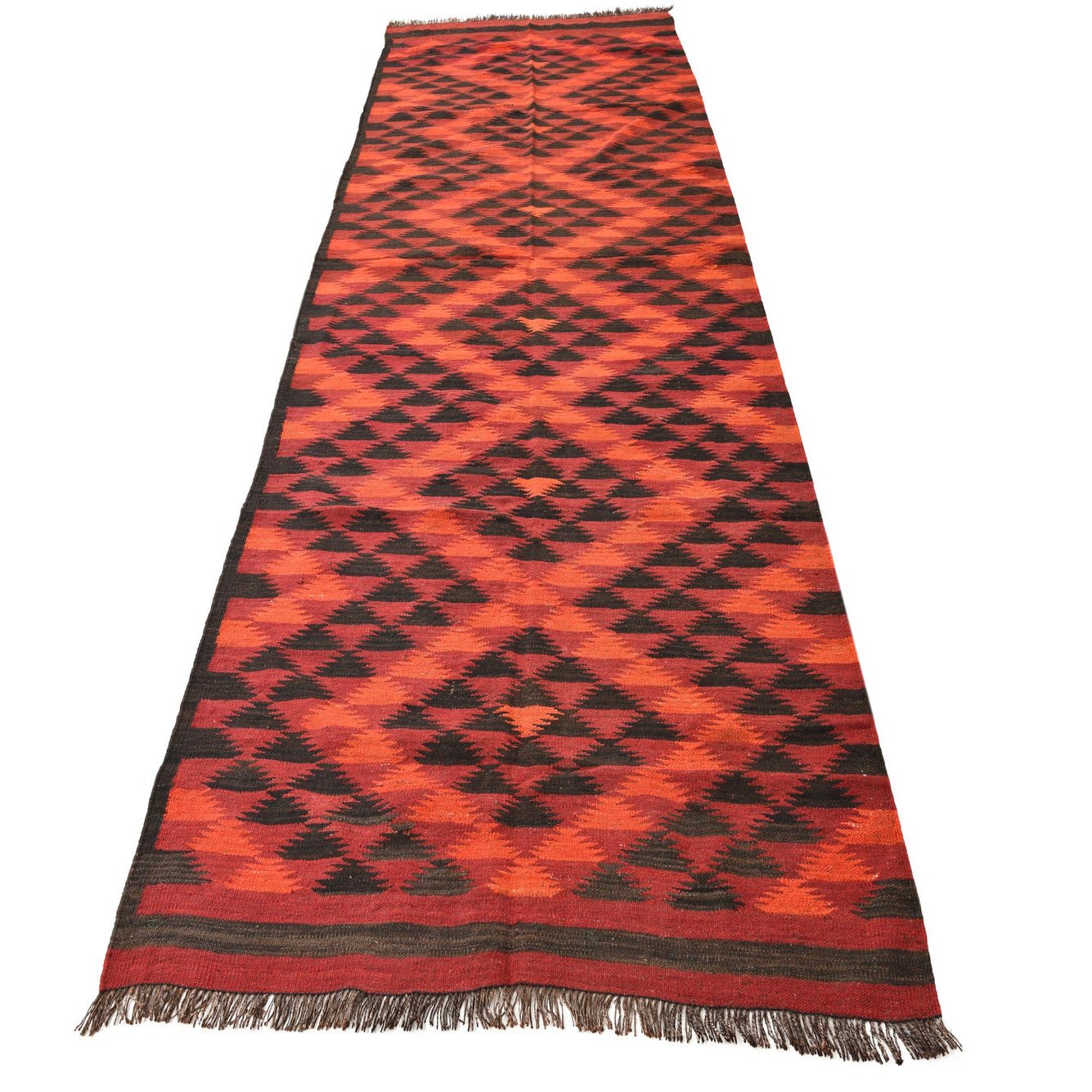 A 12 ft runner rug from the Kilim Fars collection, featuring a vibrant red and black tribal geometric pattern with flatweave texture and fringed ends.