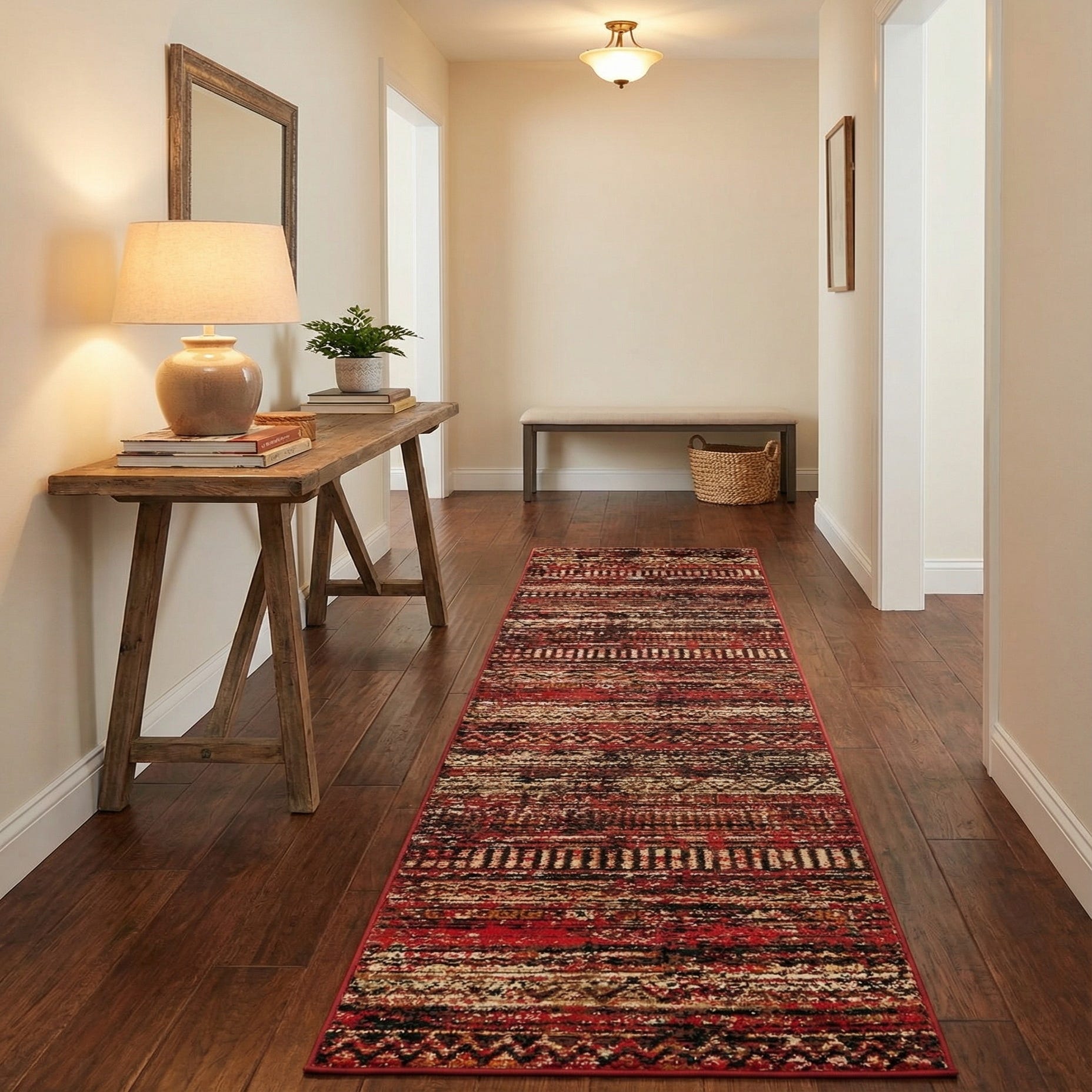 A 12 ft red runner rug with a tribal, rustic stripe pattern in shades of red, black, and beige, ideal for a hallway.
