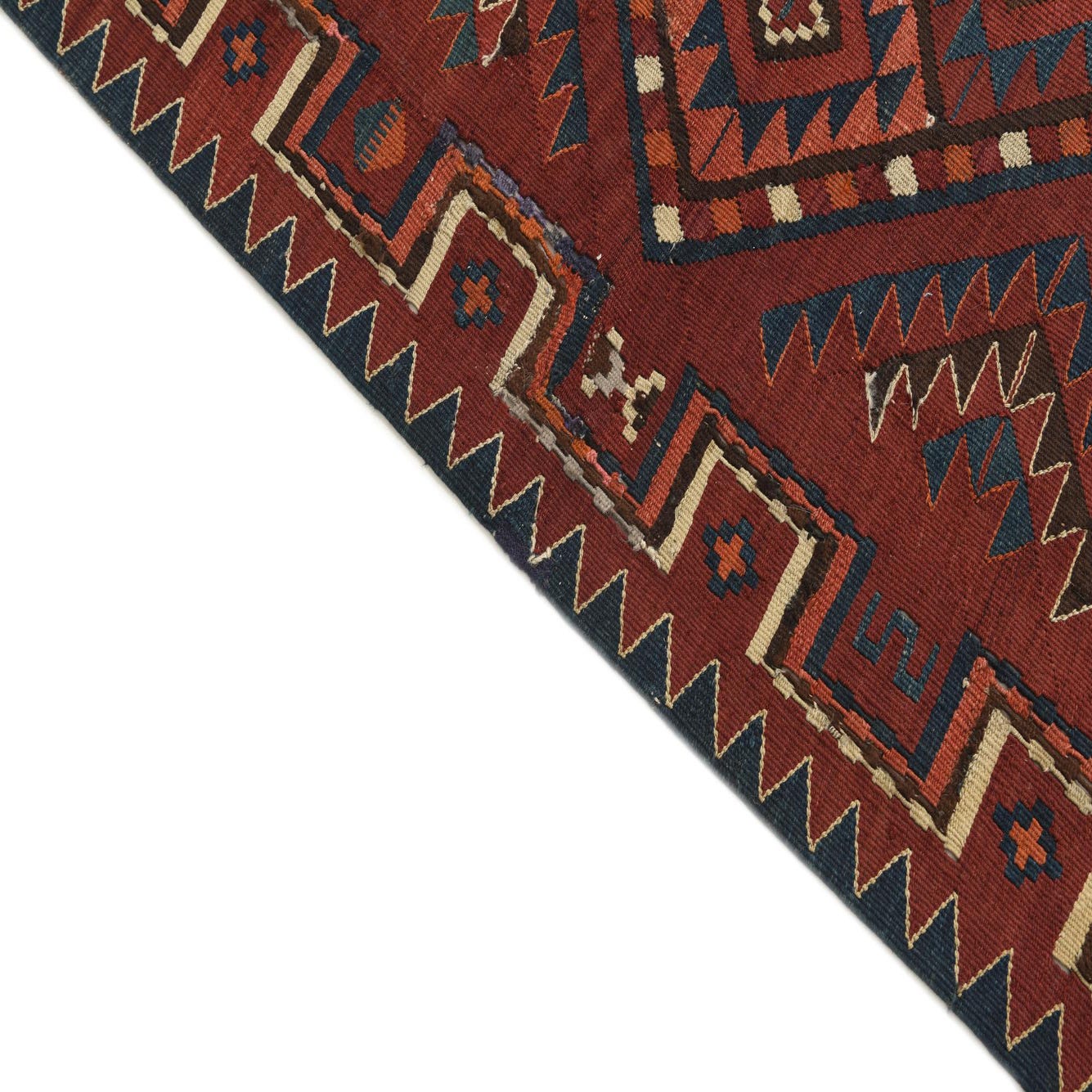 A 13 ft runner rug from the Kilim Fars collection, featuring a vibrant red field with intricate tribal geometric patterns in blue, orange, and cream.