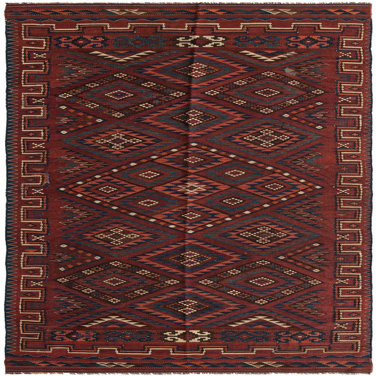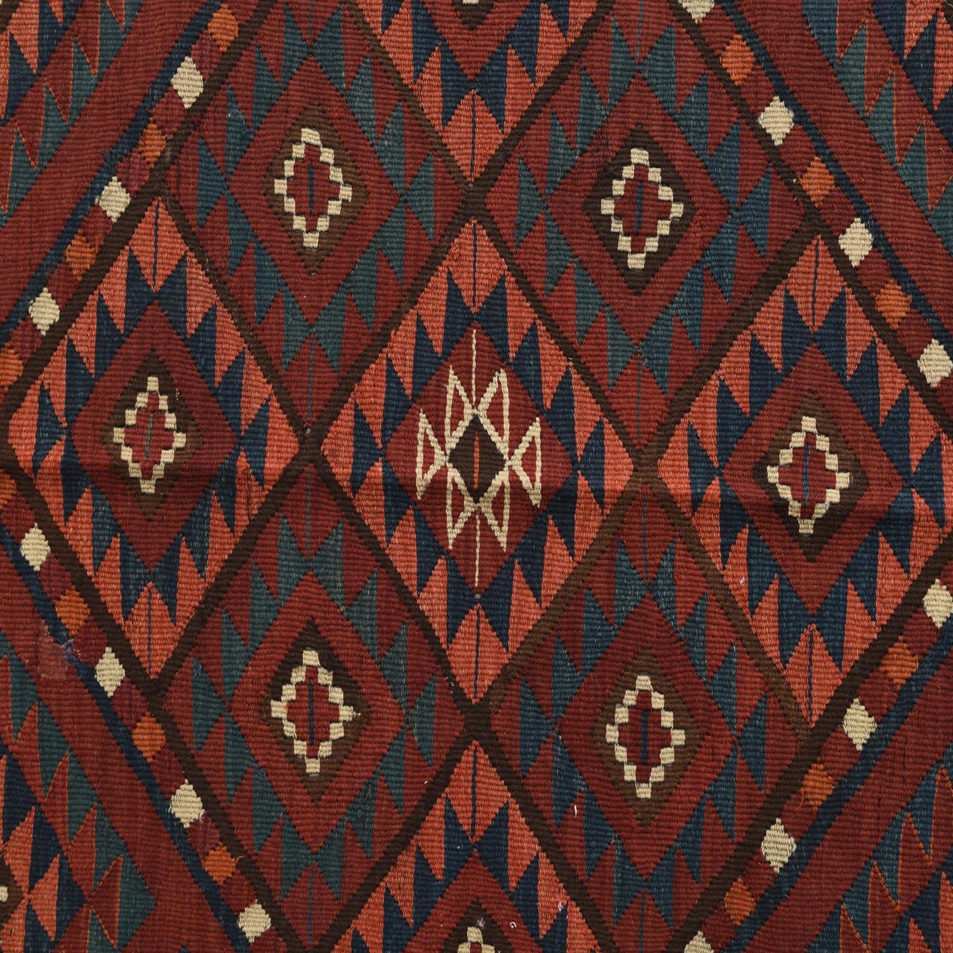 This Kilim Fars collection rug features a burgundy background with an array of geometric patterns and motifs that convey a sense of traditional craftsmanship. Accents in ivory, navy blue, and orange complement the rich base color, forming intricate diamond and zigzag designs that create a dynamic visual texture. The handwoven 100% wool construction provides a tactile experience indicative of its artisanal quality, while the fringe detailing adds a classic finish.