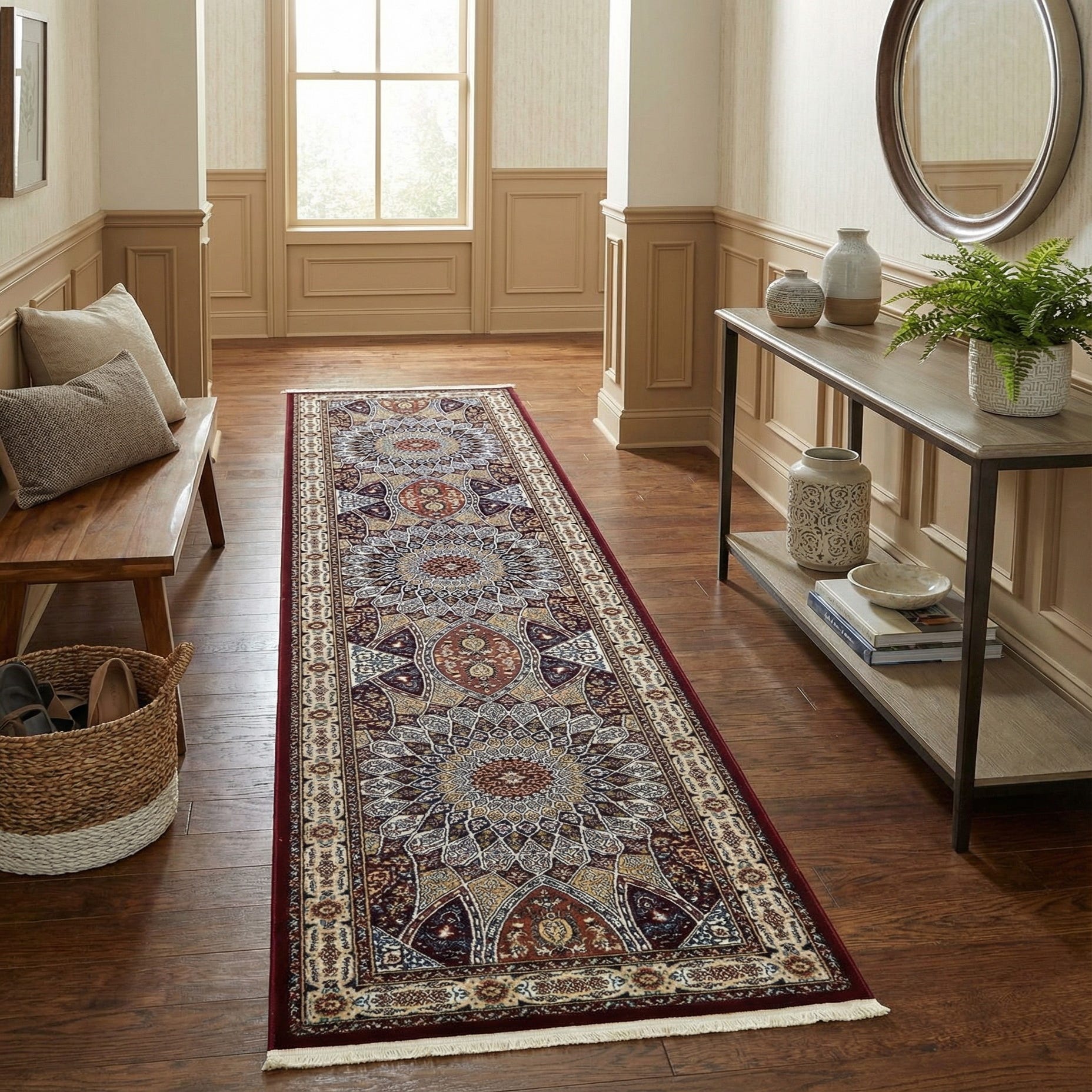 A classic Persian-inspired runner in a rich burgundy field, this rug features repeating starburst medallions that march down its length. Intricate floral arabesques, teardrop cartouches and layered borders create a balanced, detailed layout, while a narrow cream and ivory guard border frames the design. The palette pairs burgundy with beige and cream, then livens the composition with accents of blue, navy, green, puce, salmon and ivory for measured contrast and depth.