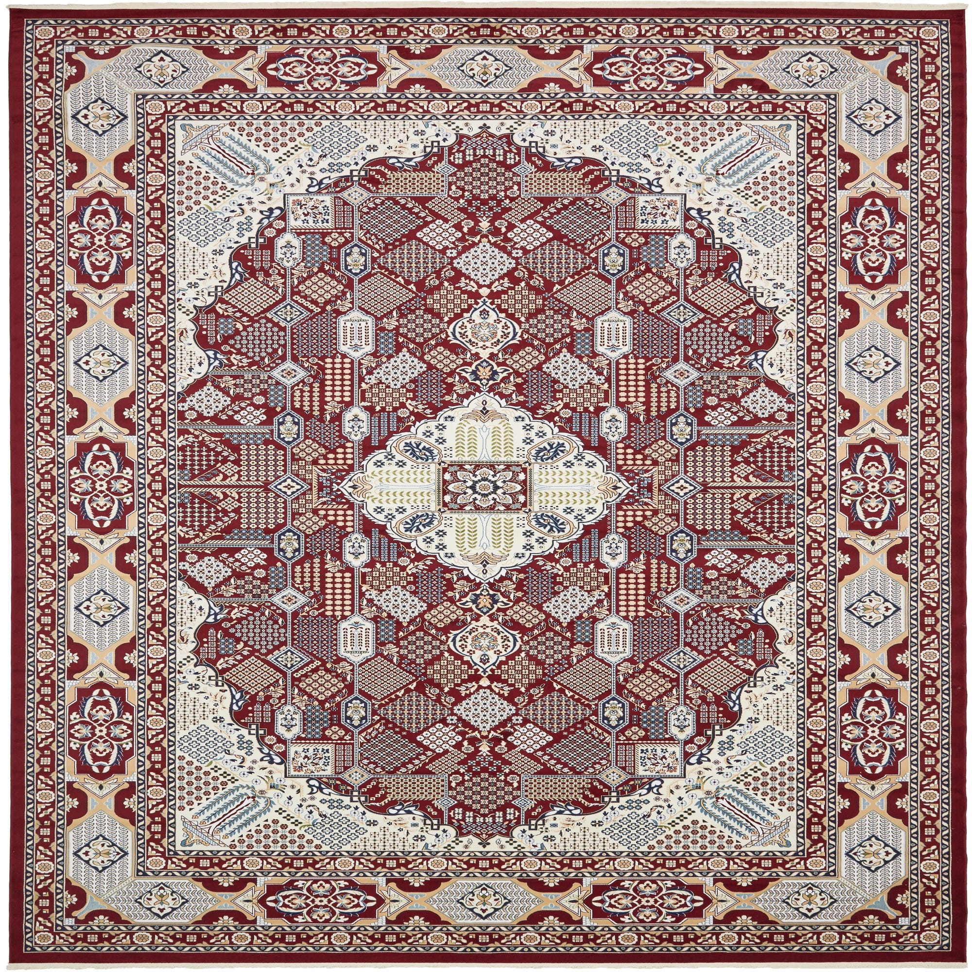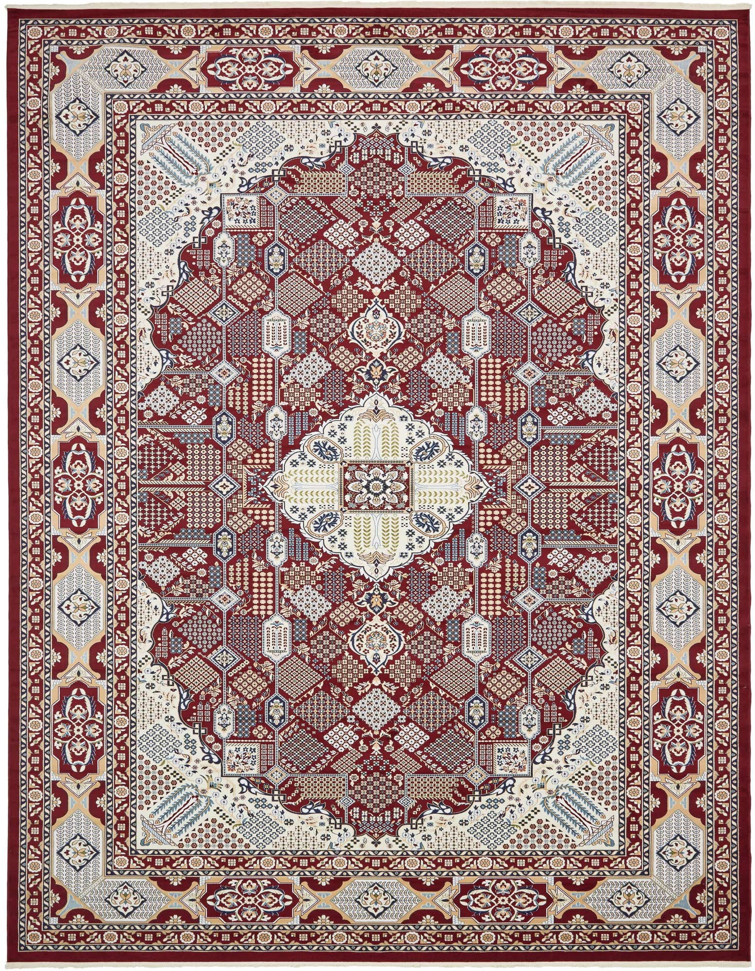 Primary color is Burgundy. Colors in this rug include: Burgundy, Beige, Blue, Cream, Green, Ivory, Navy Blue, Puce.