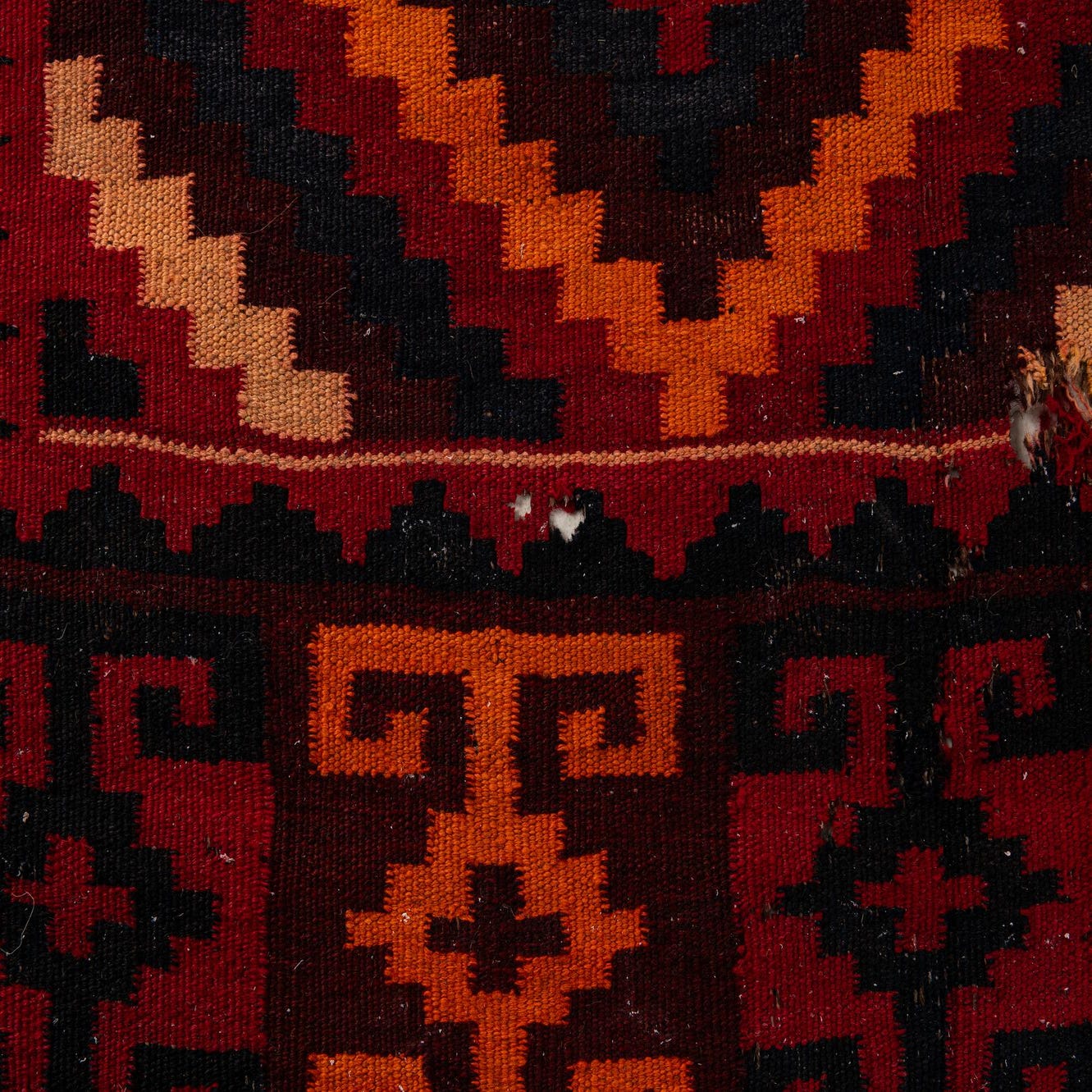The texture of this 100% wool rug is characteristic of Kilim weaves, known for their flat and durable finish, which beautifully accommodates the rug's intricate patterning. Though this runner is semi-antique, bearing the marks of time with a distinct hole and missing fringe, these attributes do not detract from its visual appeal; instead, they narrate the piece's history and authenticity.