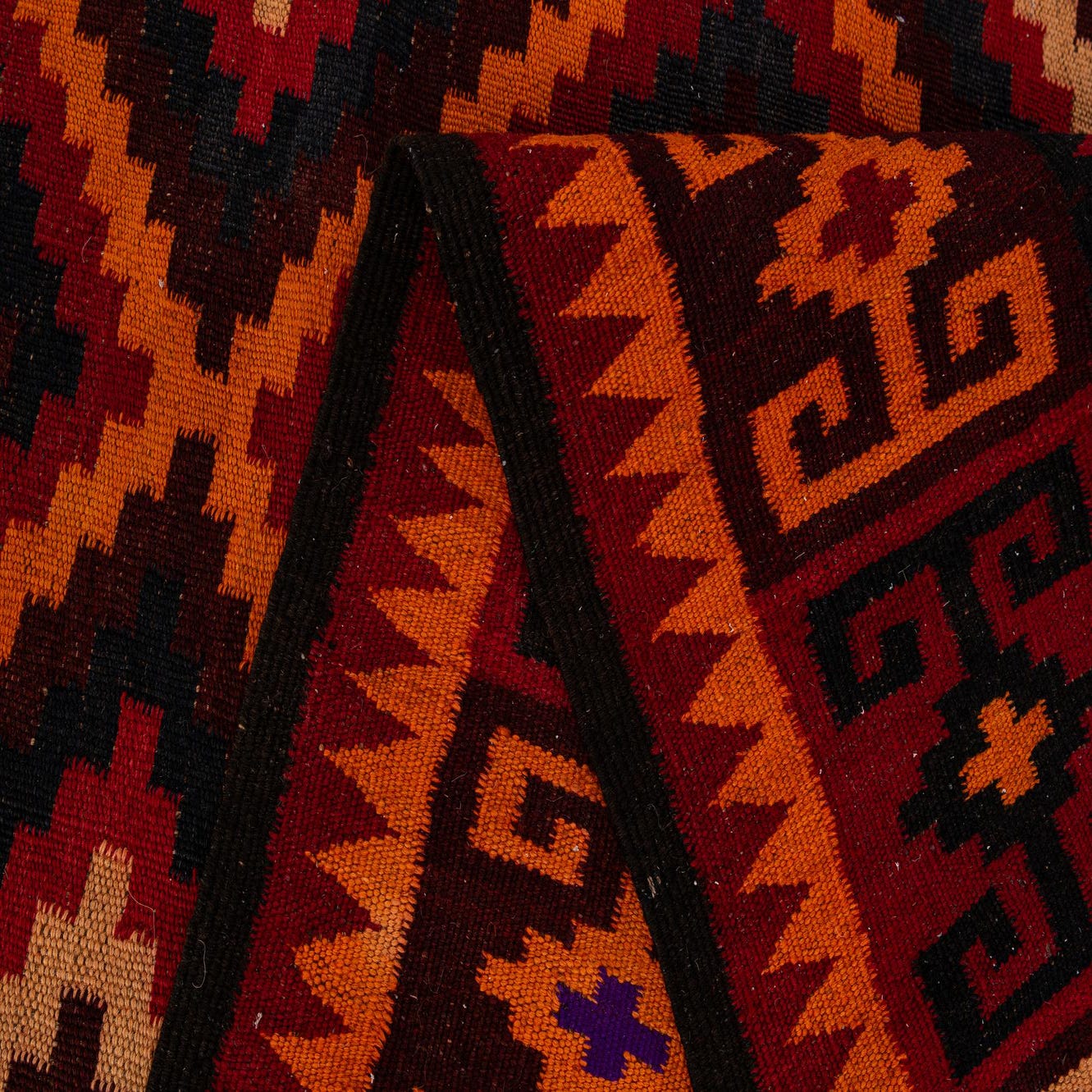 A 14 ft runner rug from the Kilim Fars collection, featuring a vibrant tribal geometric pattern in reds, oranges, and black, with colorful diamond accents.