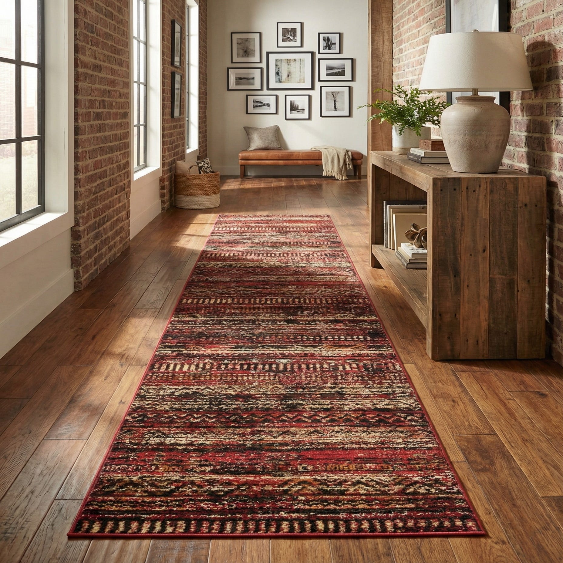 Machine-made from polypropylene, the construction delivers a low, even pile that feels softly resilient underfoot and lies flat in high-traffic zones. Place it in a long entry or hallway to anchor circulation, pair it with warm wood floors and leather seating for a cozy study or living area, or use it to add color and pattern to a neutral kitchen runner space. It also works well layered beneath a narrow console table or alongside industrial, farmhouse, or eclectic decor schemes where rich, layered tones complement mixed materials.