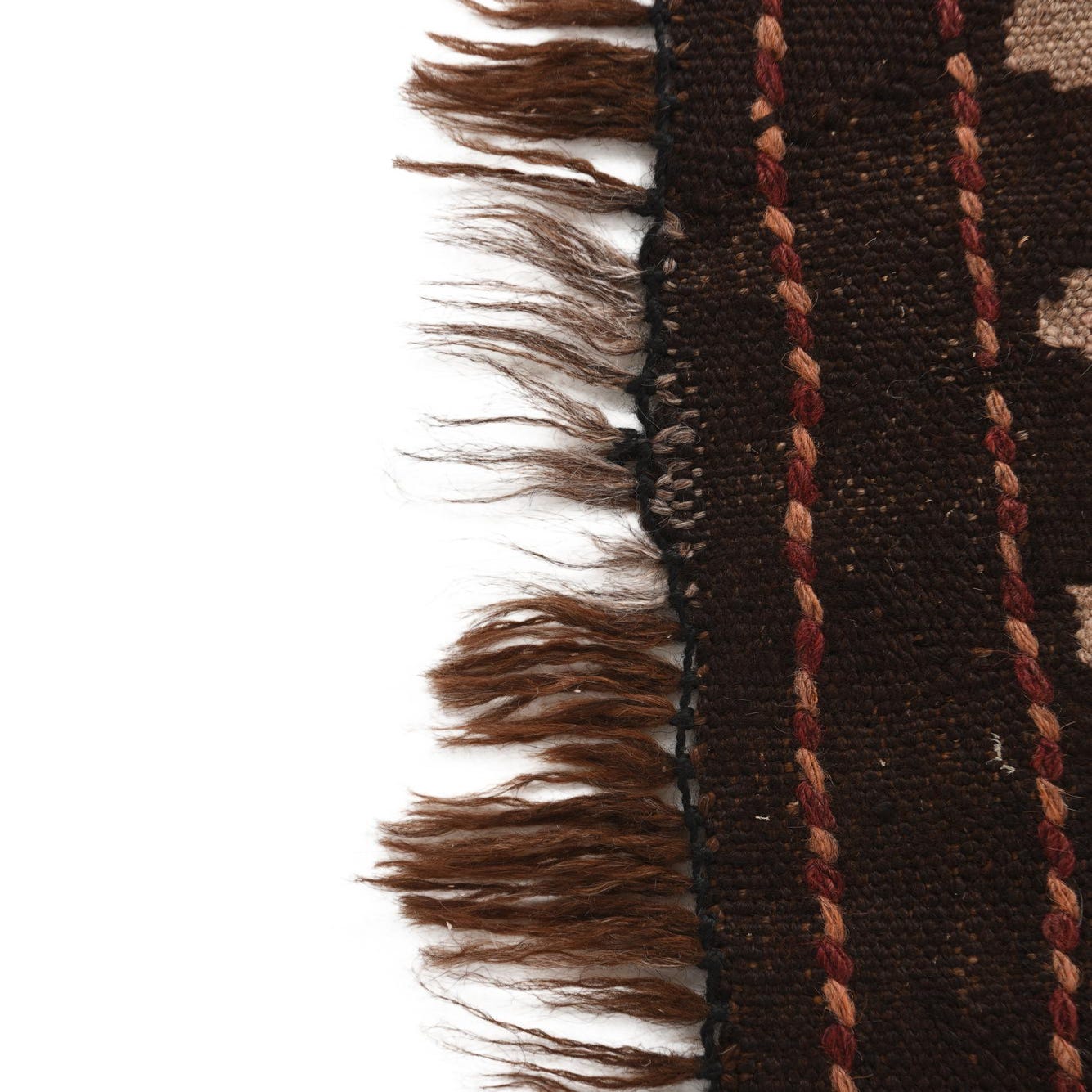 This piece's handwoven texture provides a tactile experience indicative of its artisanal heritage. Its semi-antique status, aged between 40-60 years, lends an authentic air of history and culture to the piece. While this runner exhibits condition details such as a spot stain and missing fringe, these aspects contribute to its unique character and storied past.