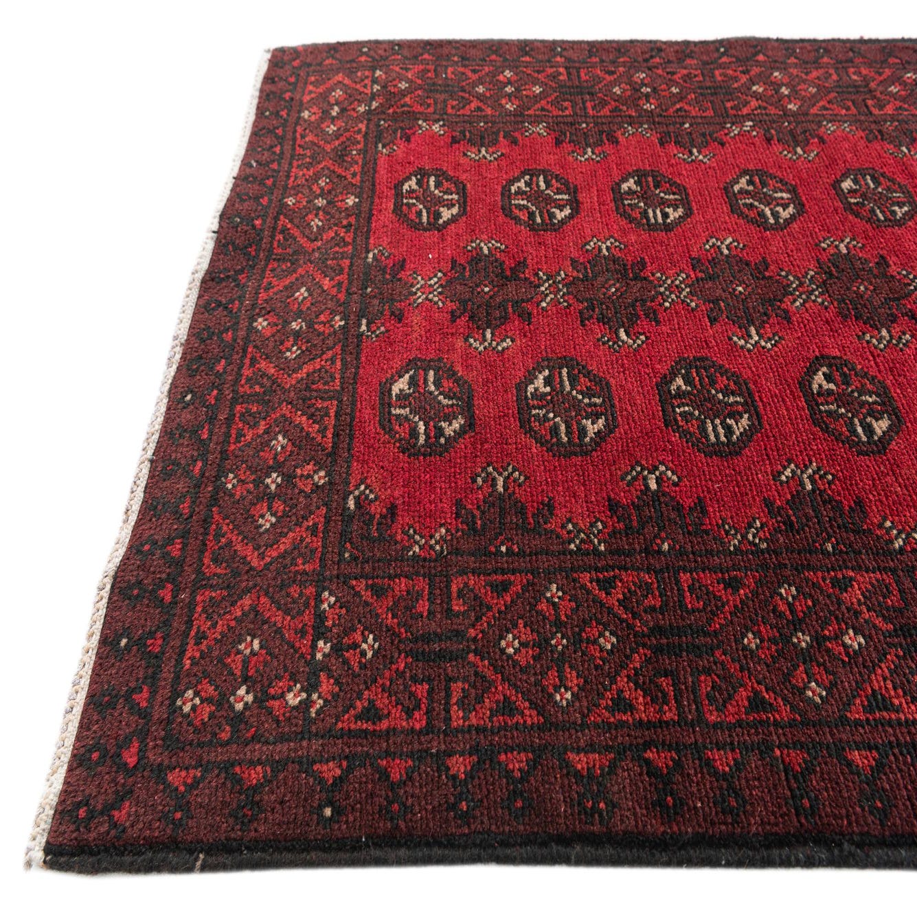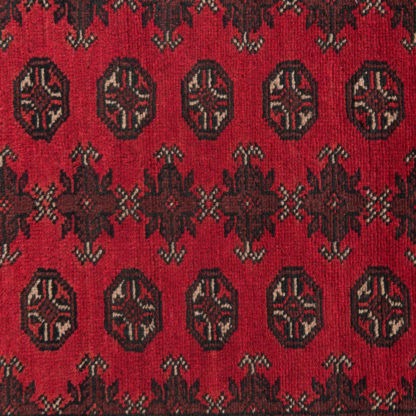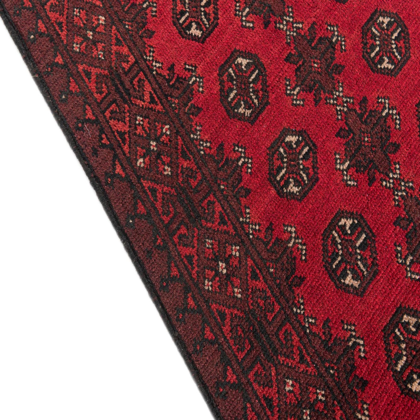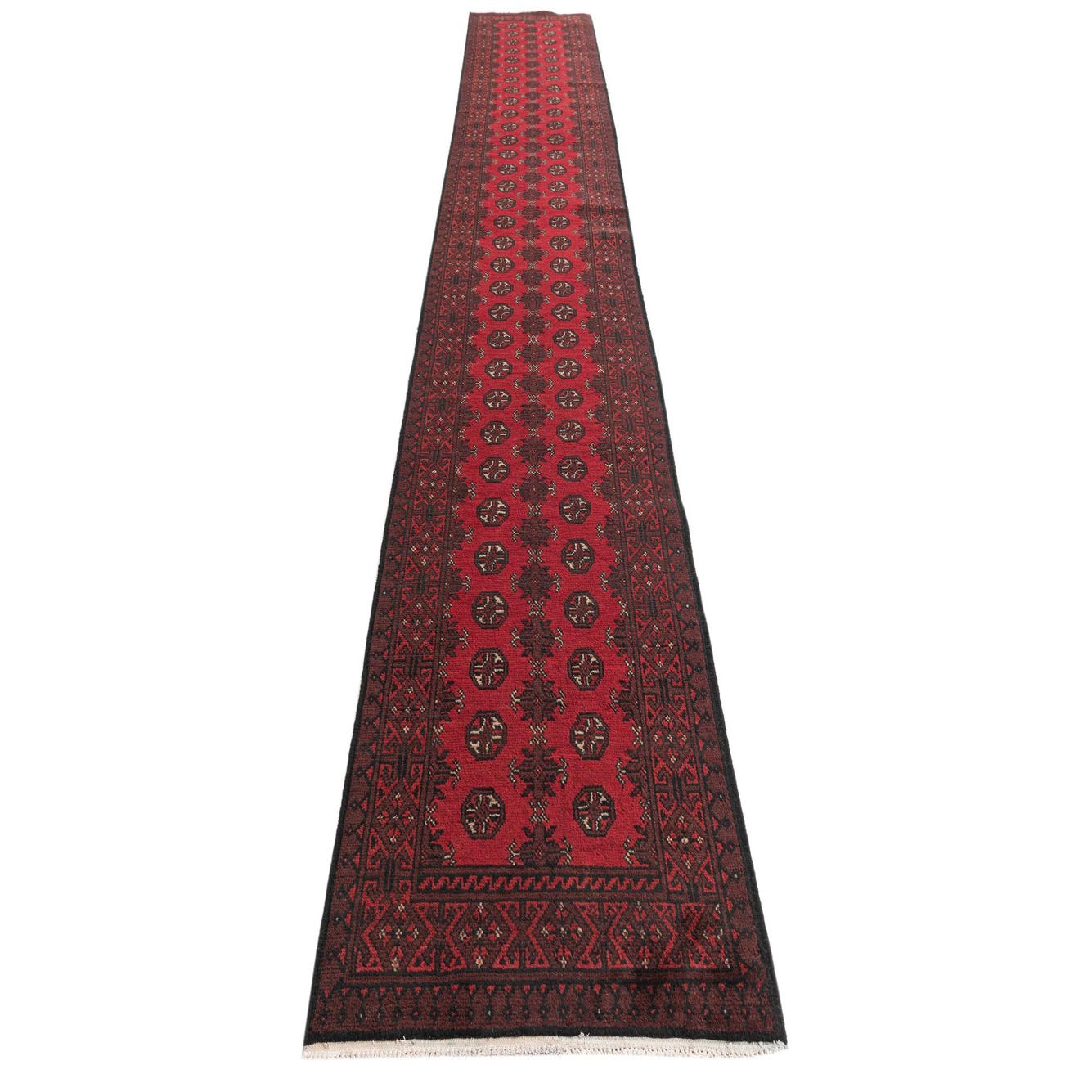 The Afghan Akhche hand-knotted runner is a sophisticated addition to any home, showcasing a time-honored pattern that adds depth and character to your space. Expertly crafted from 100% wool, this 16-foot runner displays a rich burgundy background that is adorned with distinctive traditional motifs in shades of black, maroon, and beige. The detailed border frames the central design, creating a sense of structure and refinement.