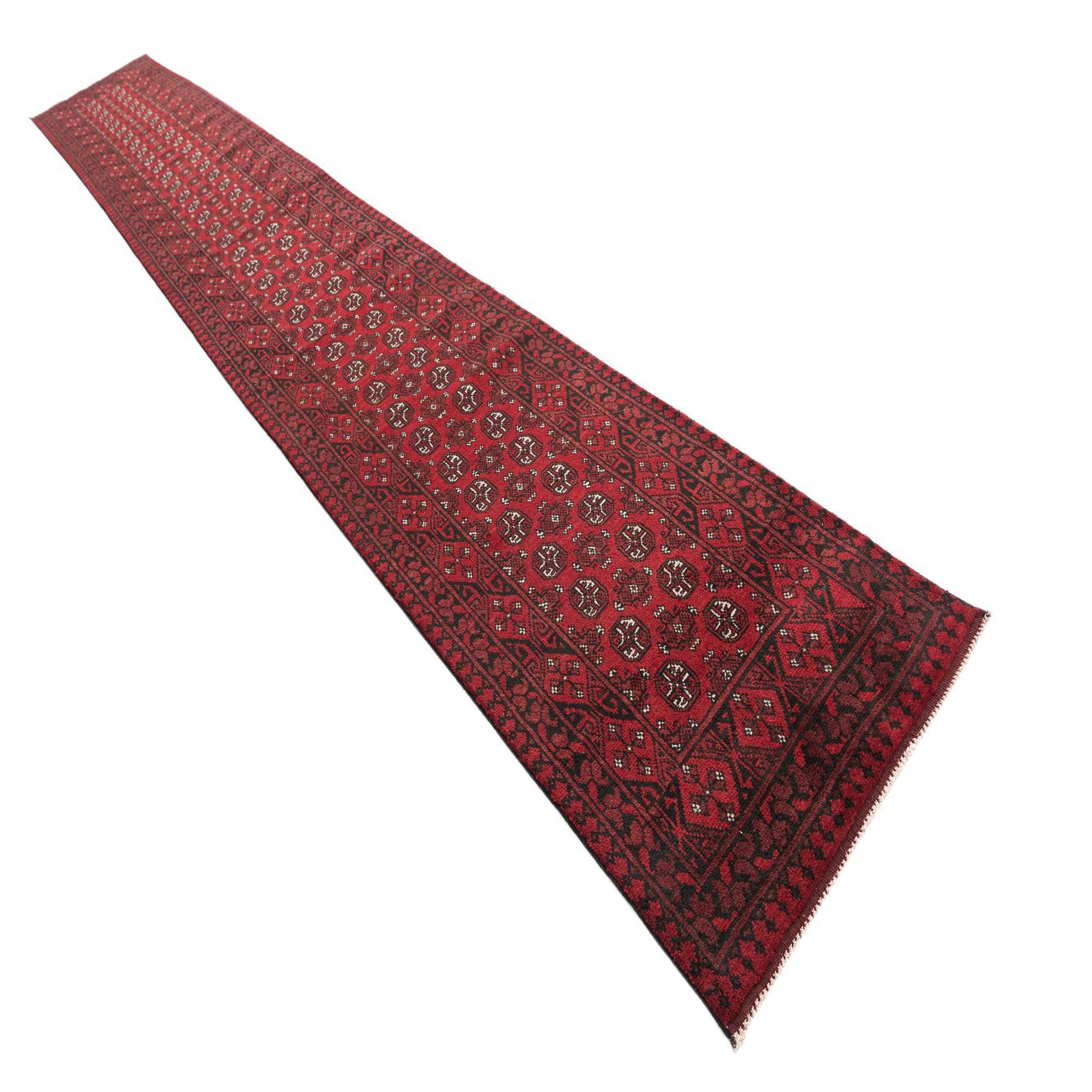 A long, thin 19 ft red runner rug with a traditional tribal pattern in dark red and black, suitable for hallways.