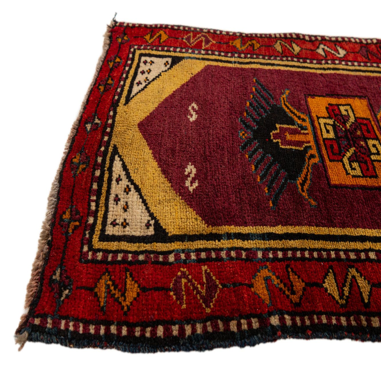 A 2x3 rectangular Anatolian wool rug featuring a central medallion in gold, black, and orange on a deep red field, with a red border.