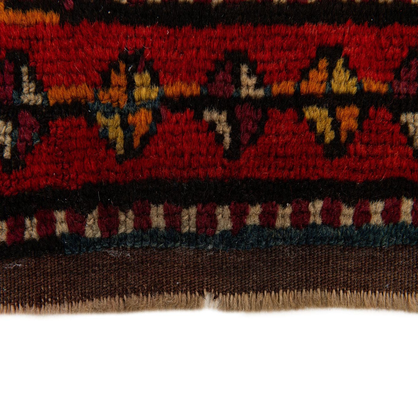 Primary color is Burgundy. Colors in this rug include: Burgundy, Black, Navy Blue, Red, Yellow, Orange.