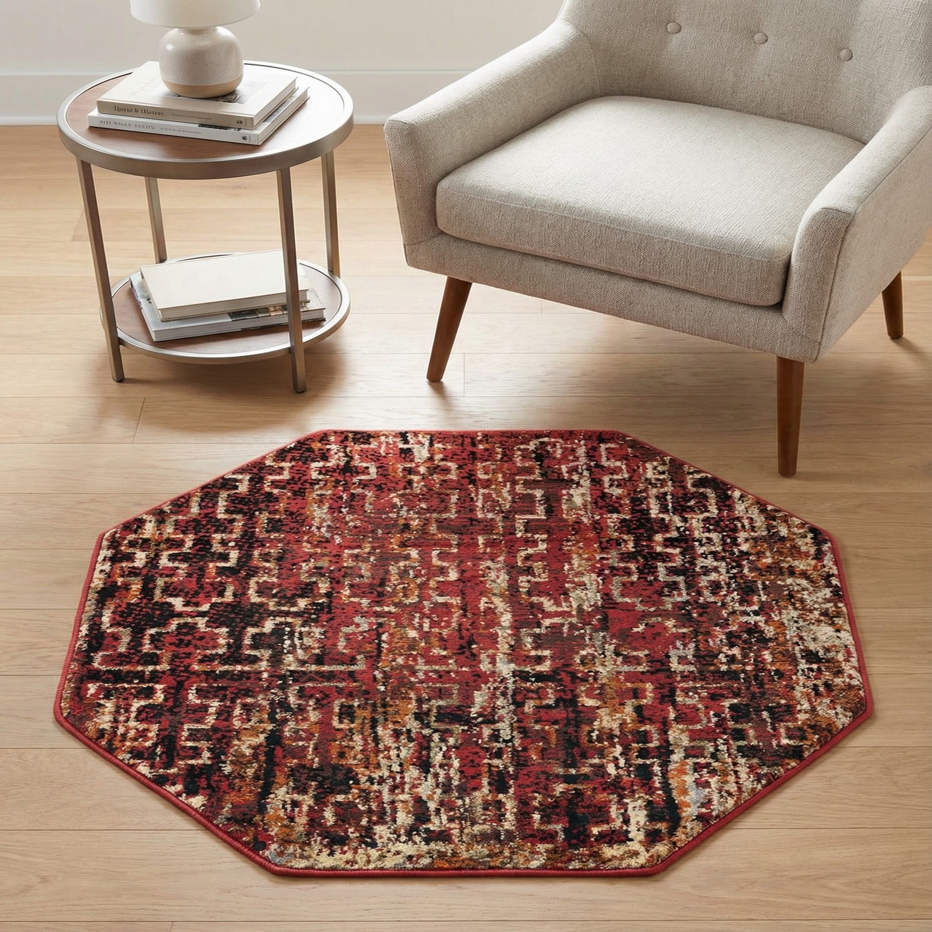 A bold, octagonal accent with a distressed abstract pattern set against a rich burgundy background. Geometric, stepped motifs and painterly streaks overlap in layers of beige, gold, brown, gray and black, creating a textured, pixel-like surface that reads both modern and vintage-inspired. Machine-made from 100% polypropylene, the low-pile weave feels smooth and slightly dense underfoot while maintaining clear definition of the pattern and color transitions.