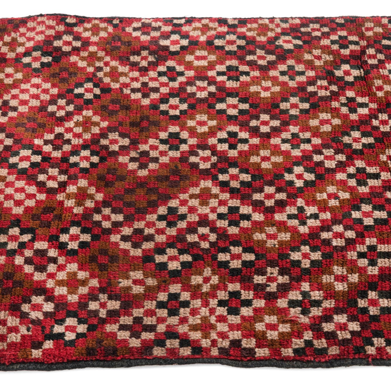 A 3x4 rectangular Balouch rug with a traditional Persian tribal pattern in various shades of red, black, and tan.