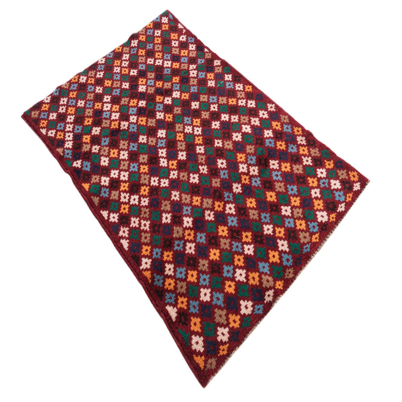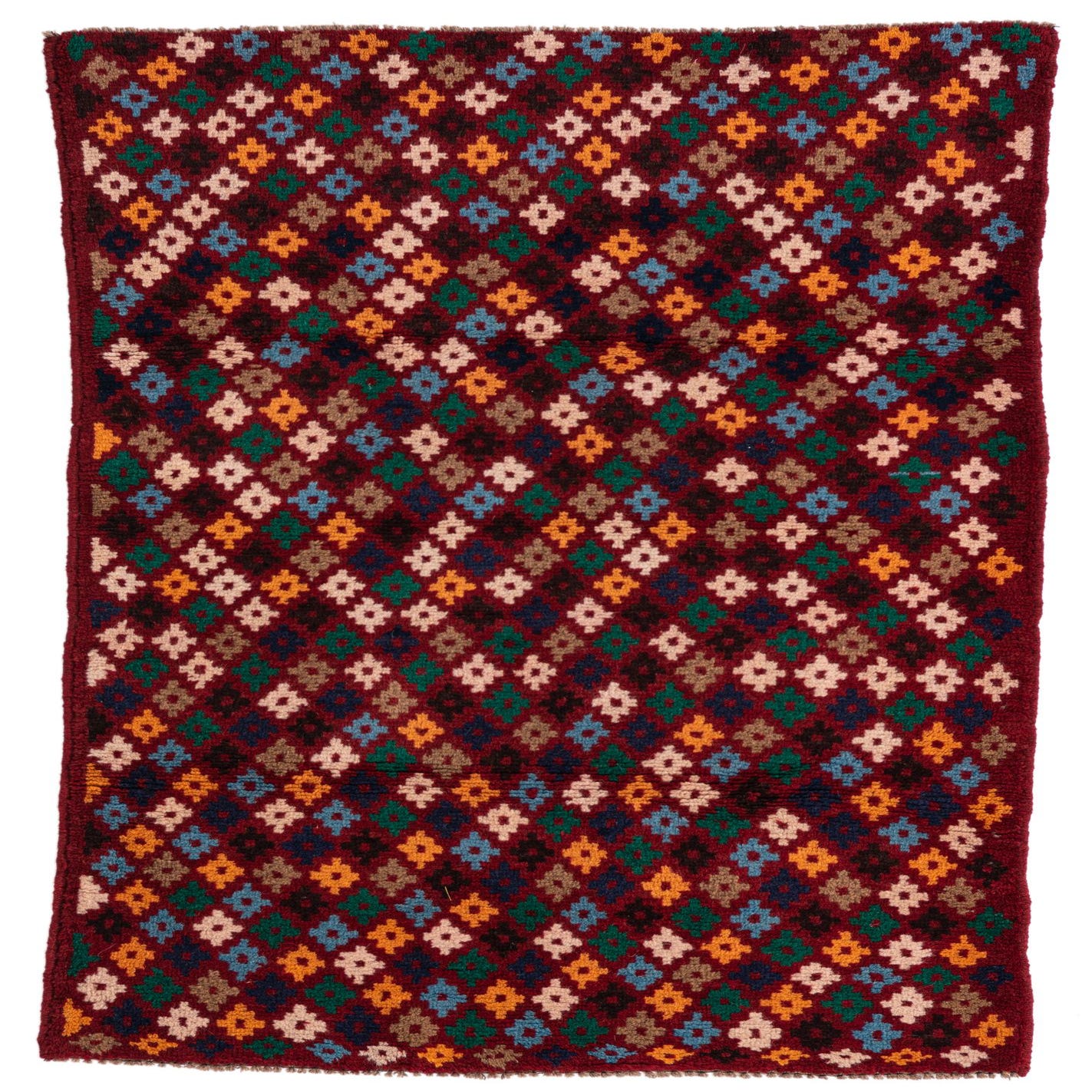 A 3x4 rectangular Balouch wool rug featuring a traditional tribal pattern of colorful diamonds on a deep red background.