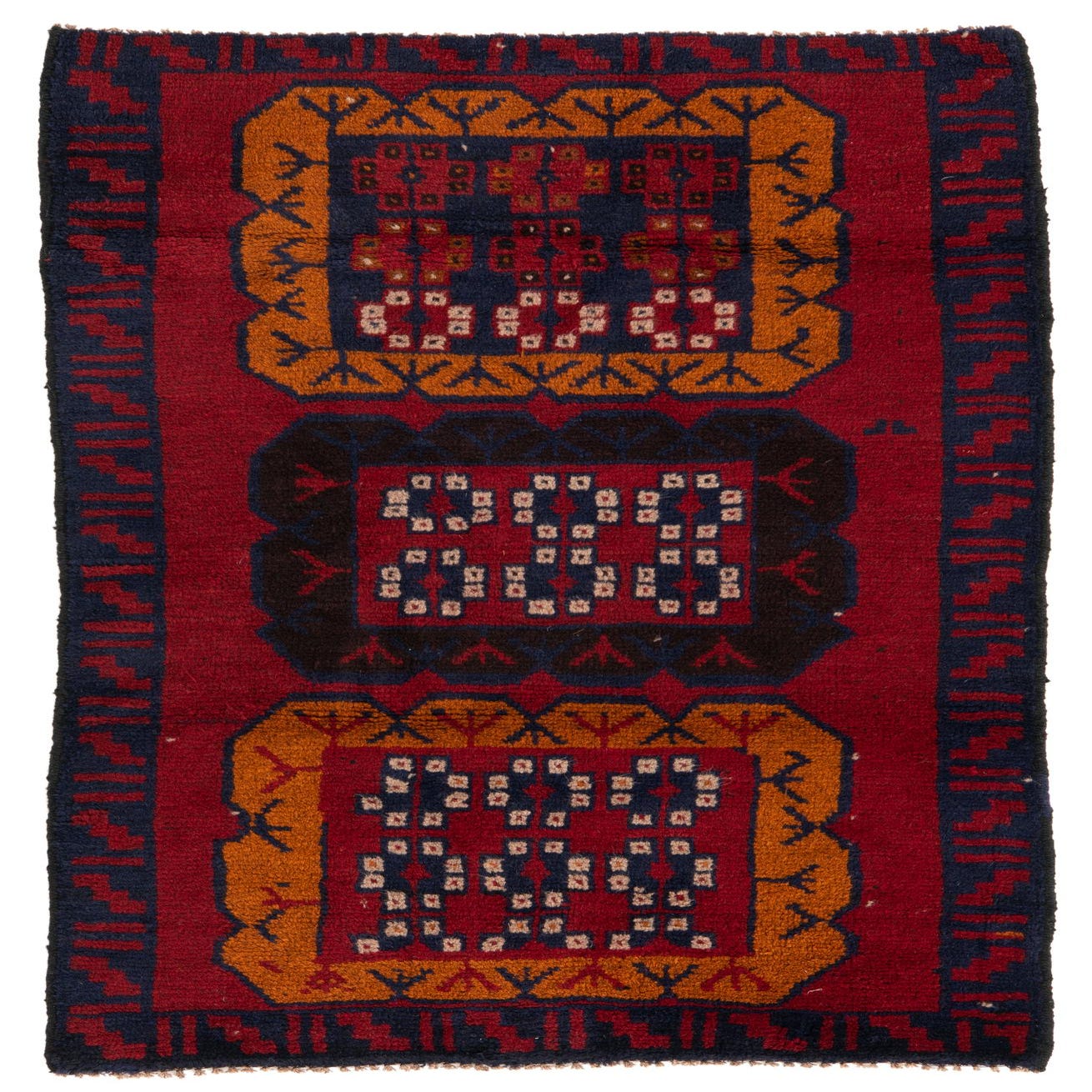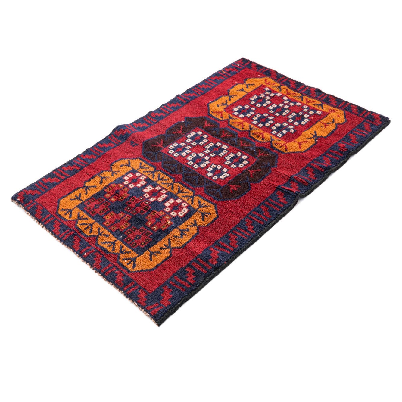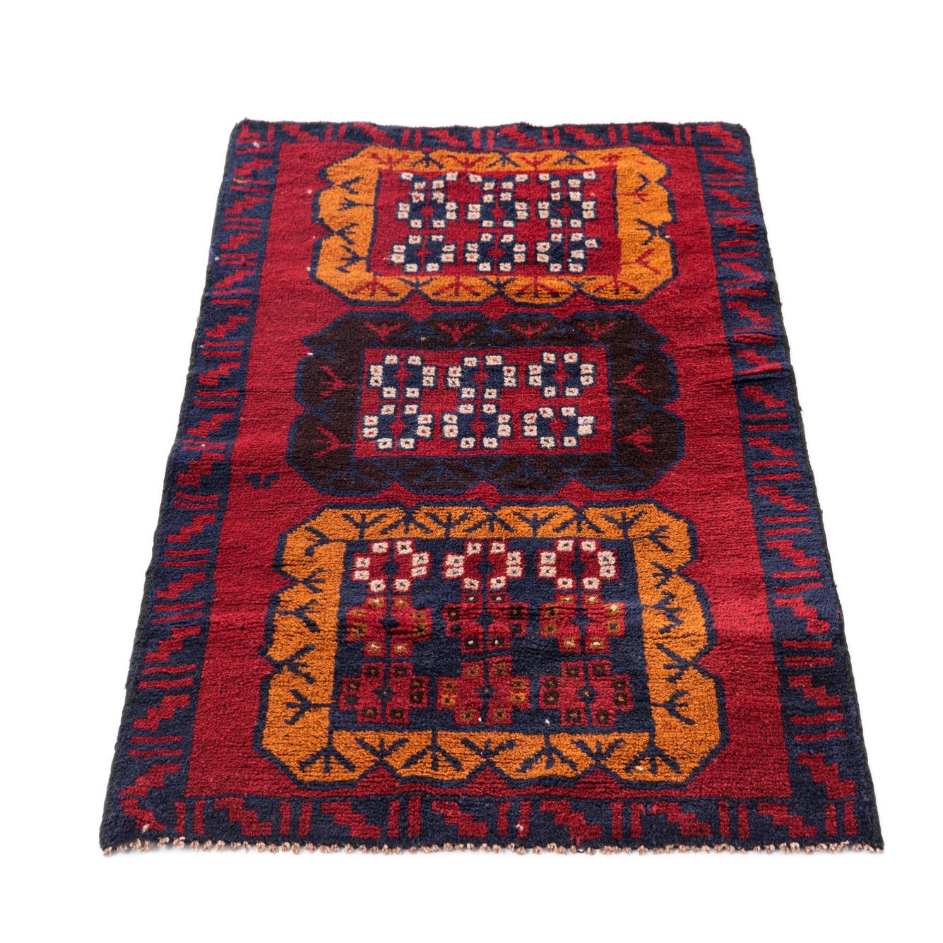 A 3x4 rectangular Balouch wool rug featuring a traditional Persian tribal design in deep reds, navy blue, and orange.