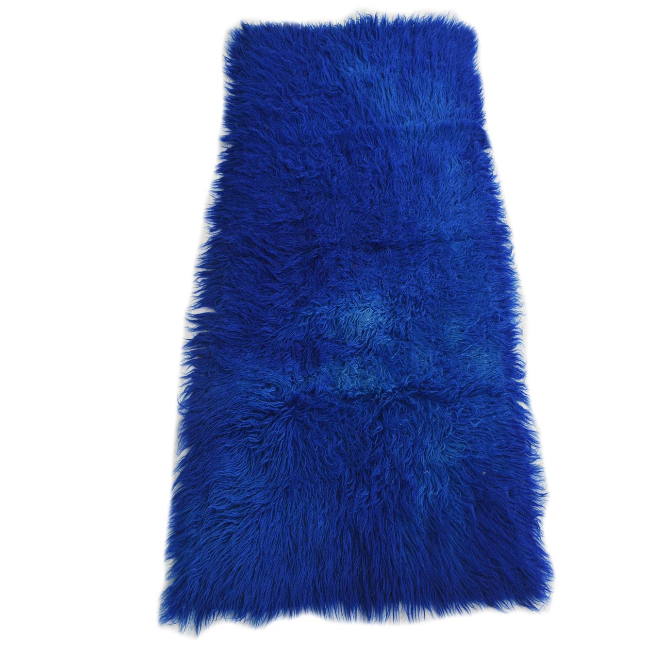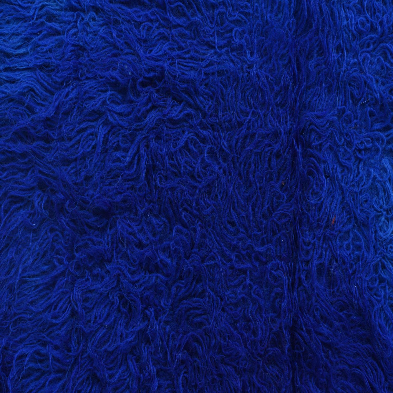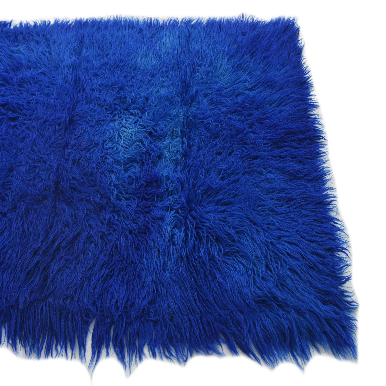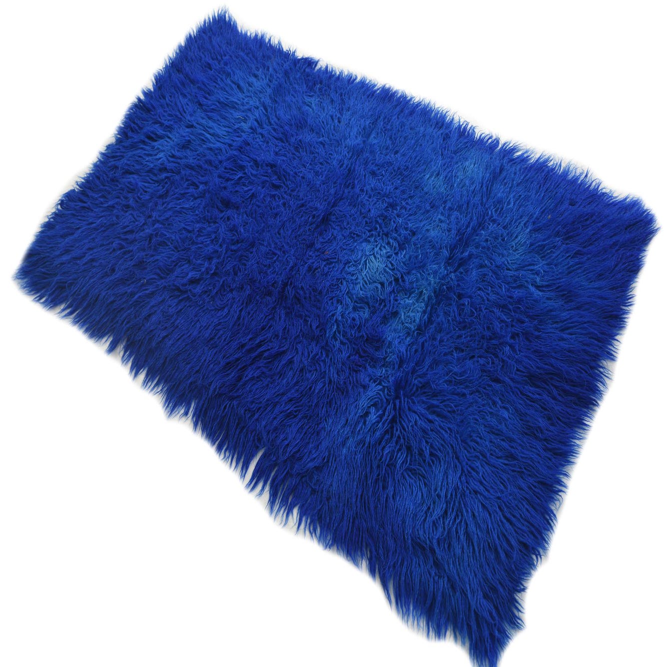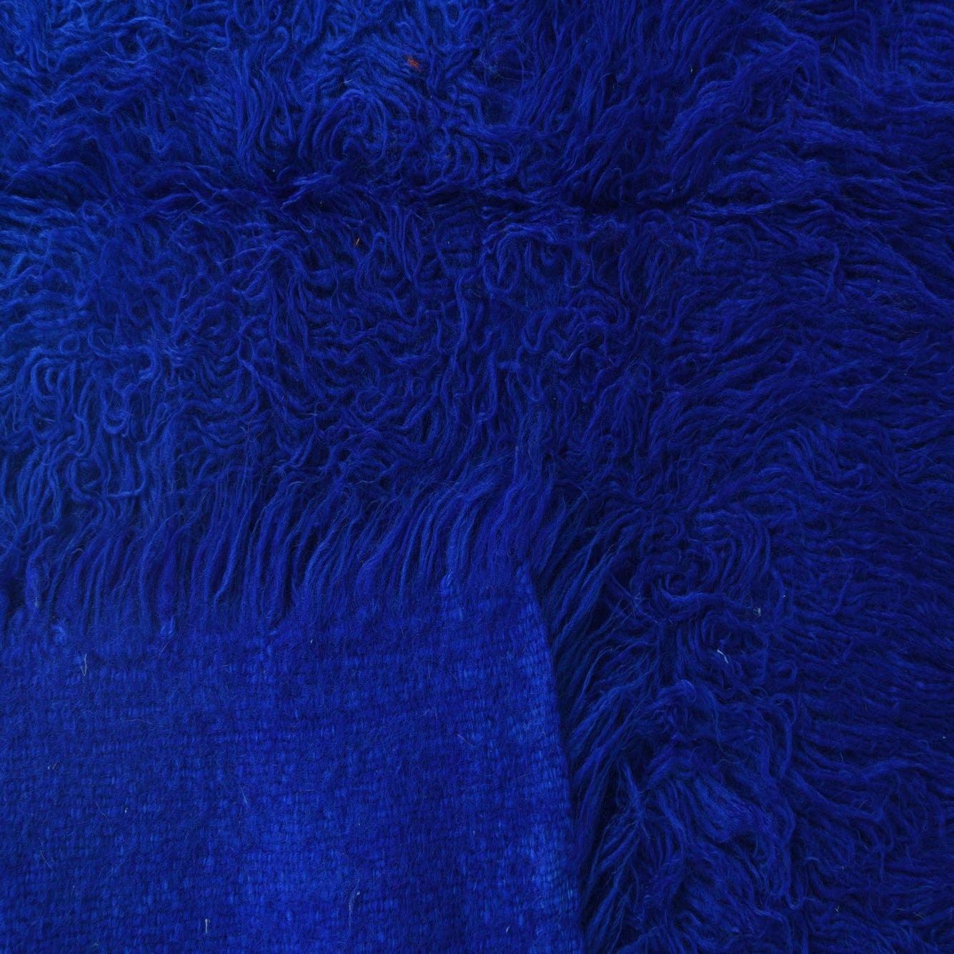 A vibrant 3x4 rectangular shag rug in deep blue with subtle variations, adding texture and color to an indoor space.