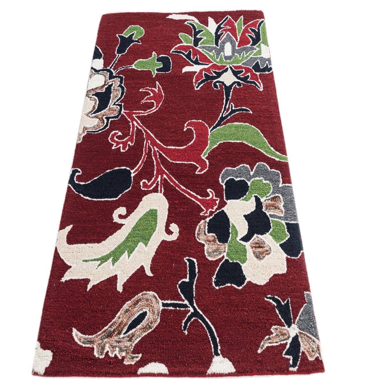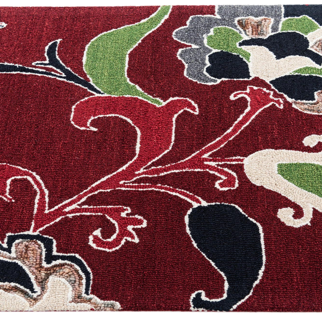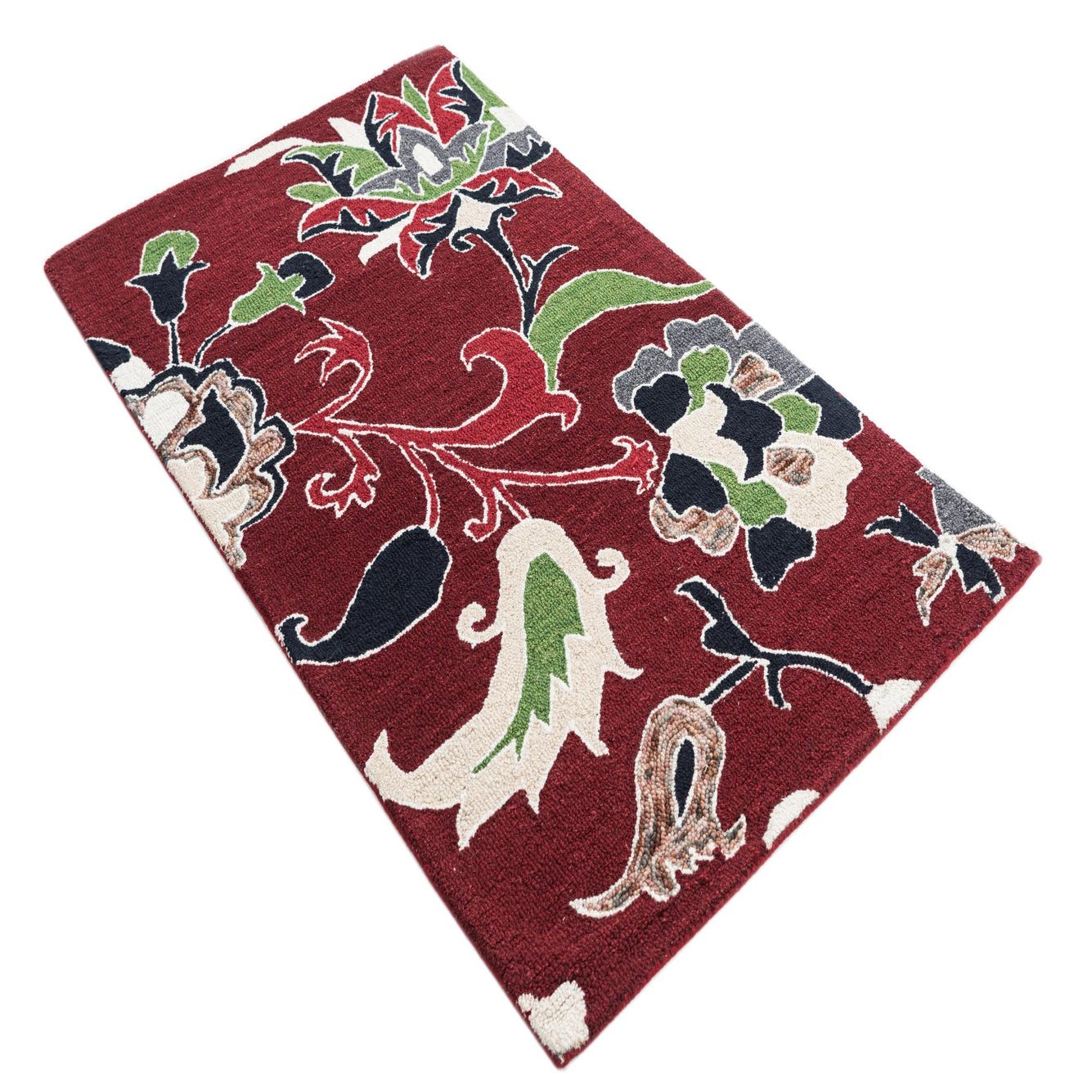 A 3x5 rectangular modern wool and cotton rug with a deep red background and large floral patterns in green, black, cream, and red.