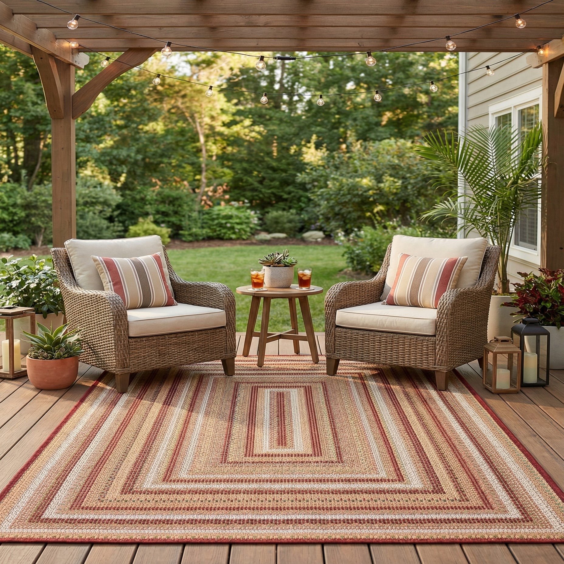 Machine-made from 100% polypropylene, the rug has a low-profile, tightly woven feel that is firm underfoot while still comfortable to touch. The synthetic fiber construction delivers color retention and easy placement in active areas. Use it to define a small seating group on a covered patio, add warmth to an entry or mudroom, or layer beneath a bistro table—pairs well with warm wood tones, leather seating, navy or olive accents, and casual coastal or farmhouse interiors.