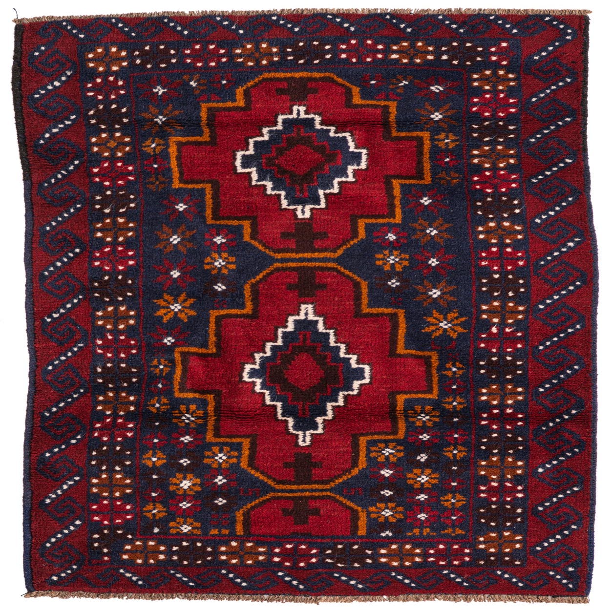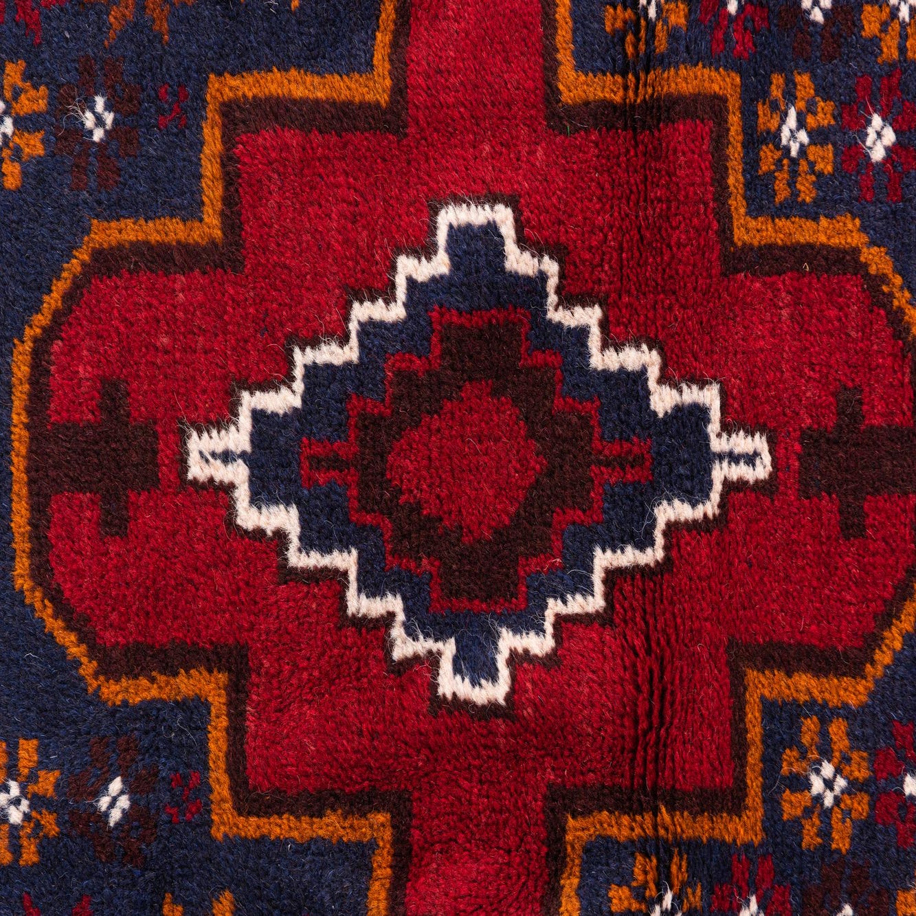 A 3x5 rectangular Balouch wool rug featuring a traditional red and navy tribal medallion pattern.