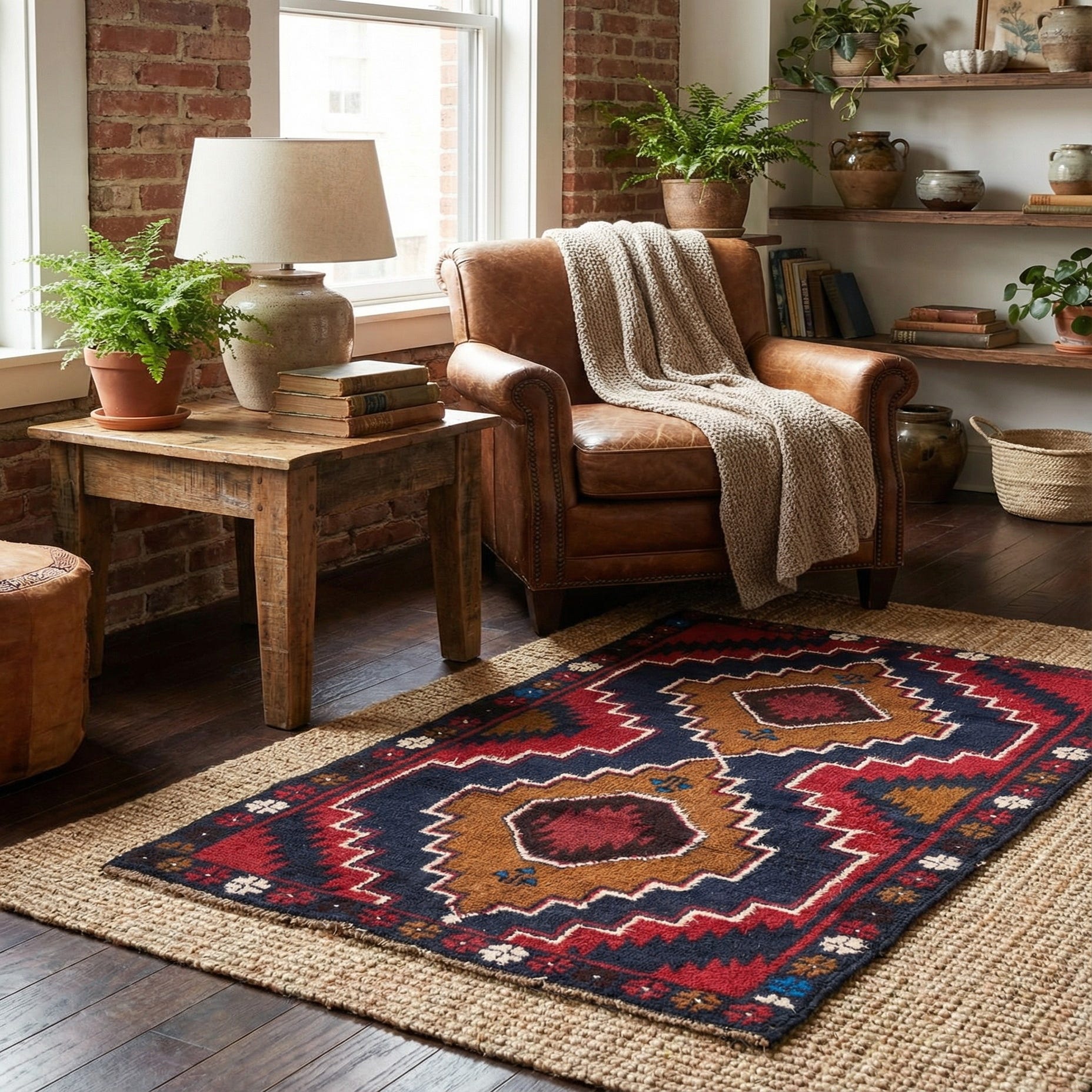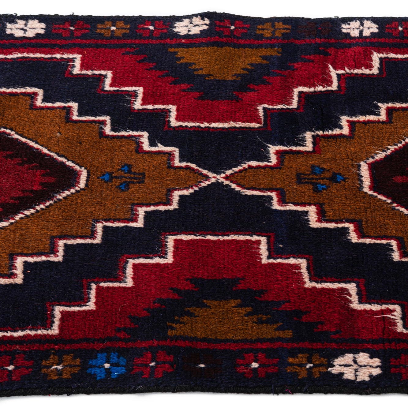 A handmade 3x5 rectangular Balouch rug with a tribal medallion pattern in deep reds, navy, and brown.