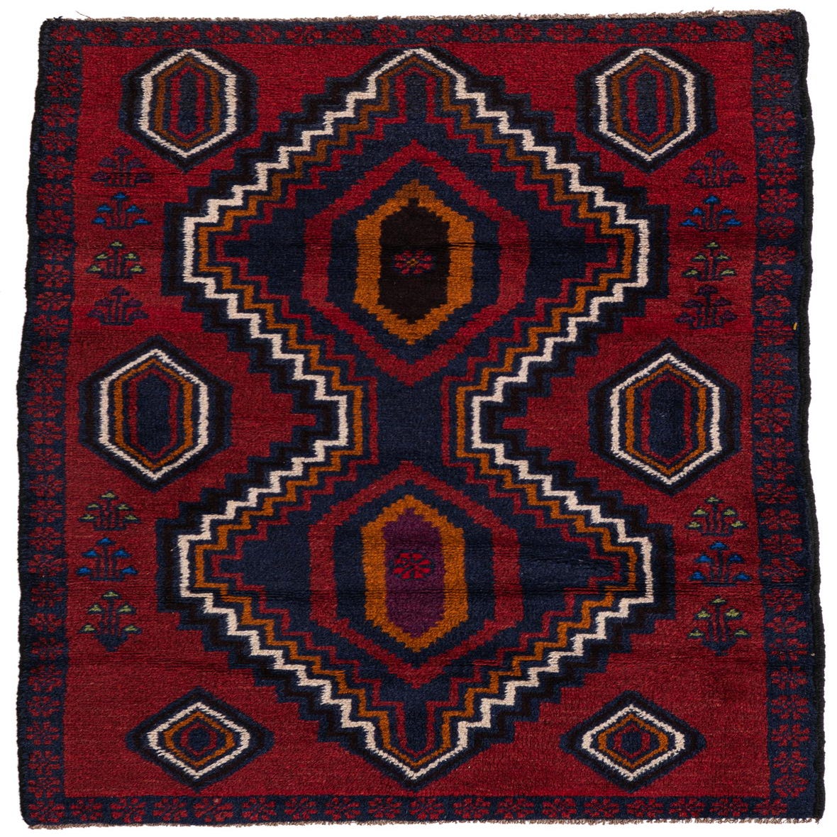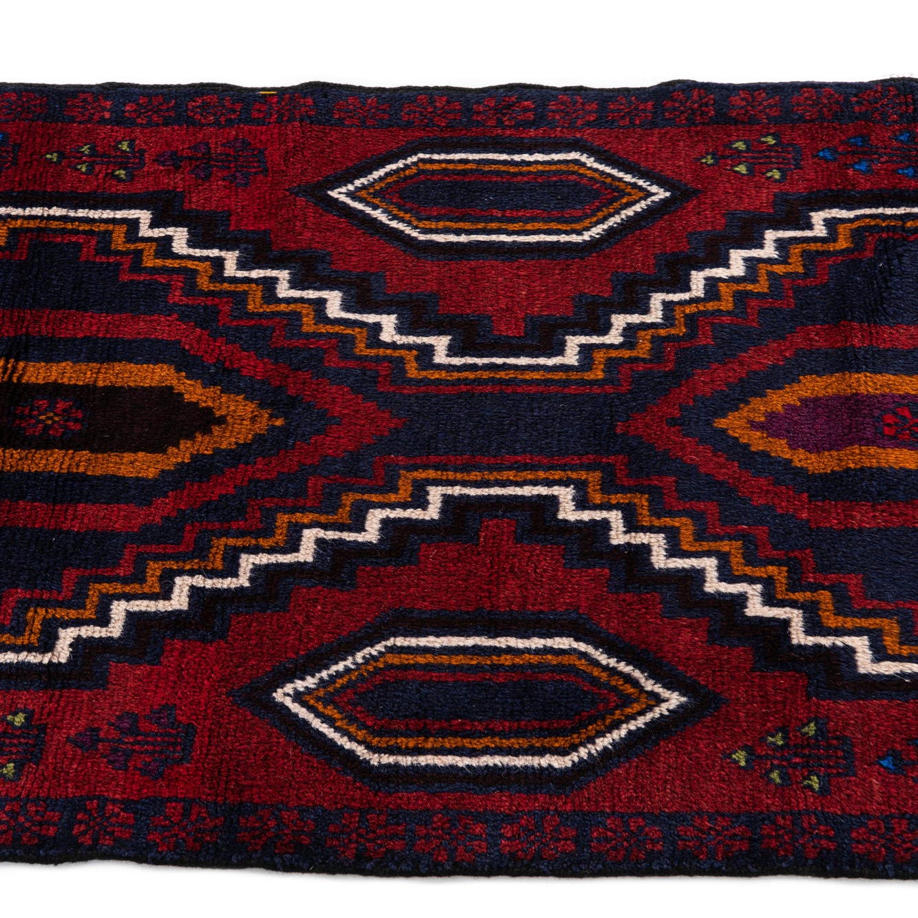A 3x5 rectangular Balouch rug with a deep red field and a central navy, black, and orange tribal medallion design.