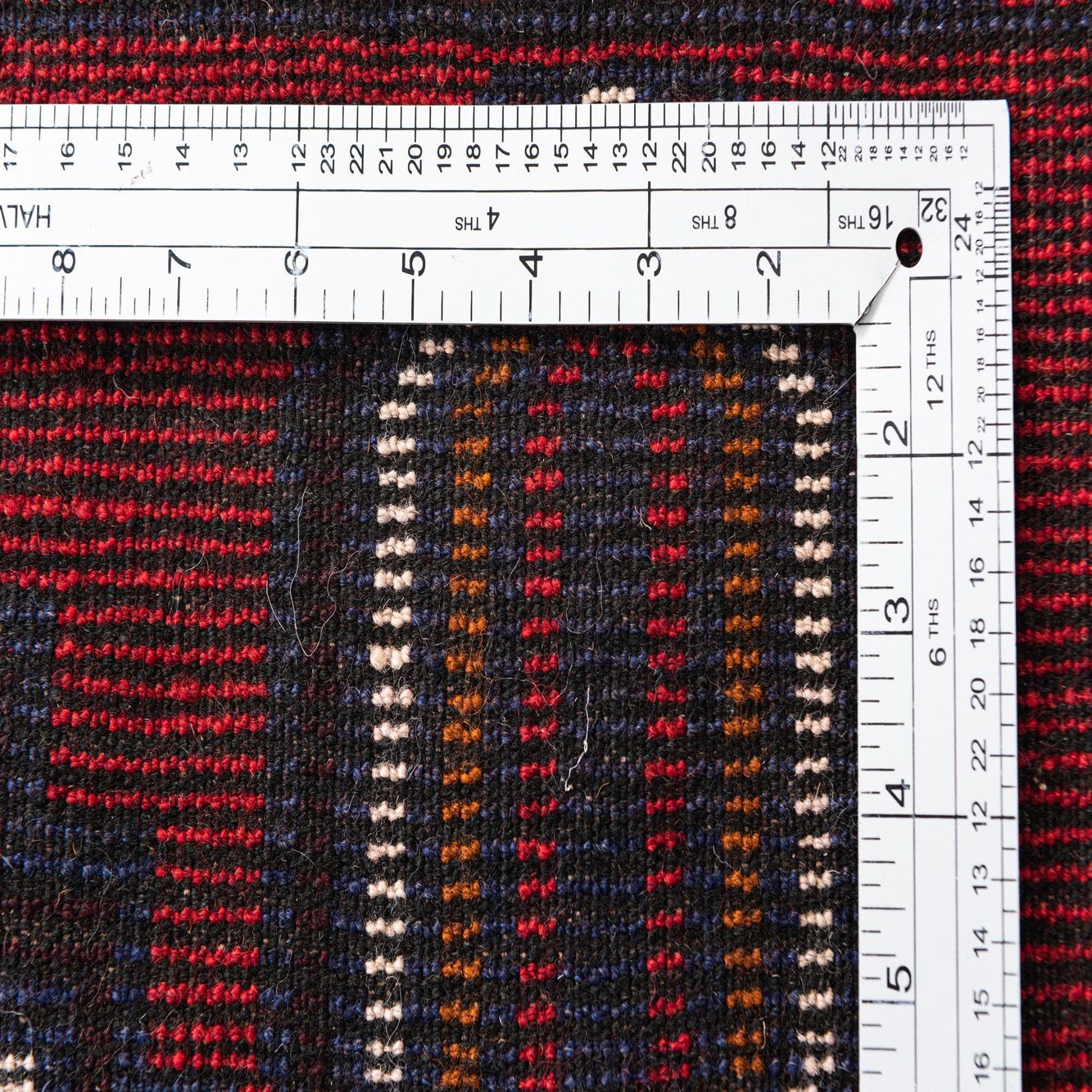 The Balouch collection offers a hand-knotted rug of 100% wool construction, presenting a durable and plush addition to any space. This specific 3x5 rug features a captivating geometric pattern that displays a bold arrangement of shapes and traditional motifs. Colors incorporated in the design include burgundy as the dominant background shade, enriched by harmoniously integrated hues of green, ivory, navy blue, terracotta, and maroon. The depth of color and intricate designs weave an alluring visual tapestry for the floor.