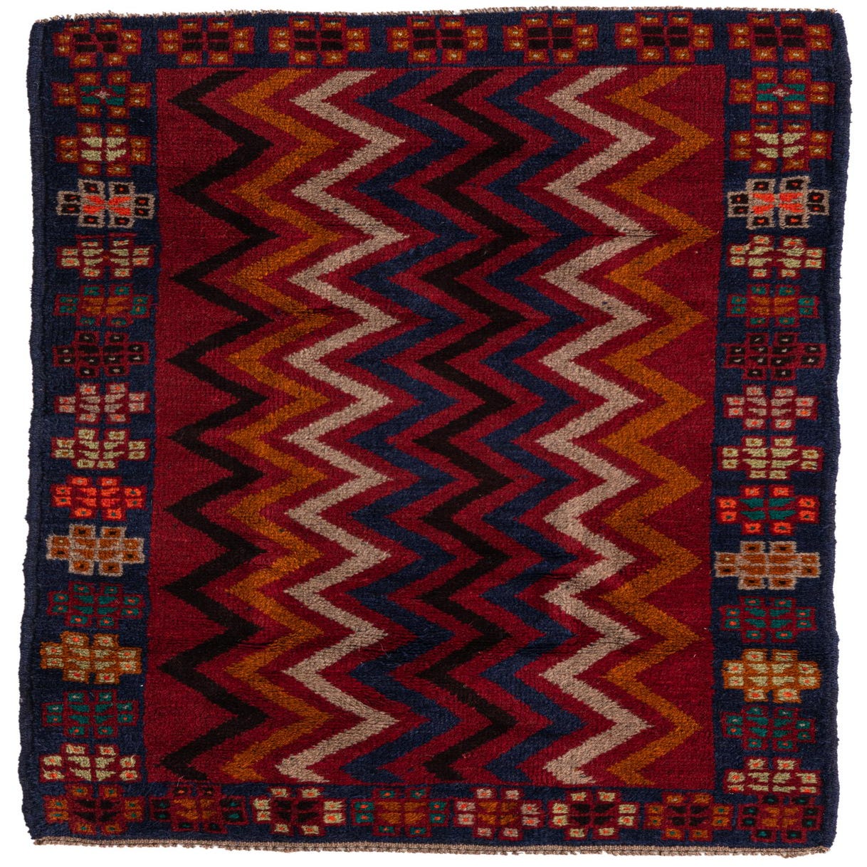 The Balouch Collection offers a 3x5 hand-knotted rug crafted from 100% wool, showcasing a rich tapestry of cultural heritage and artistry. The background color of deep burgundy sets a warm, versatile foundation, complemented by a dynamic array of colors including light brown, navy blue, terracotta, gold, and green. Its pattern features strong geometric shapes creating a captivating chevron motif that draws the eye along its length, bordered by intricately detailed guard bands which add depth and complexity to the design.