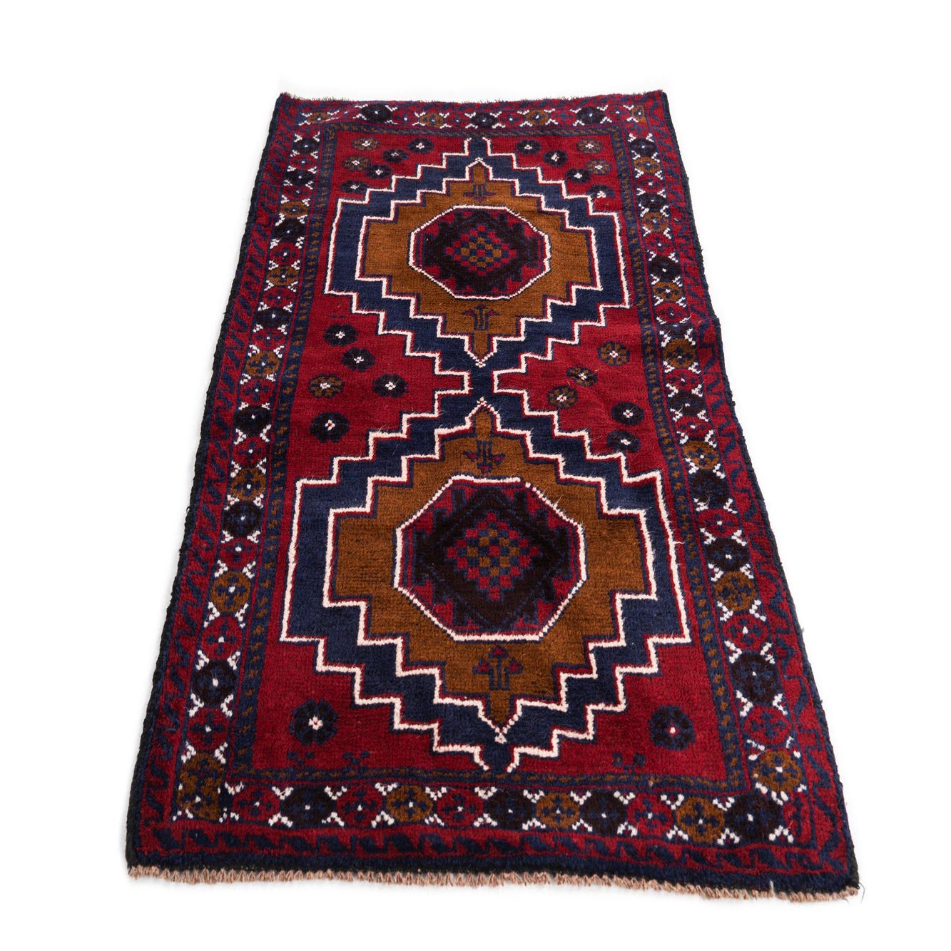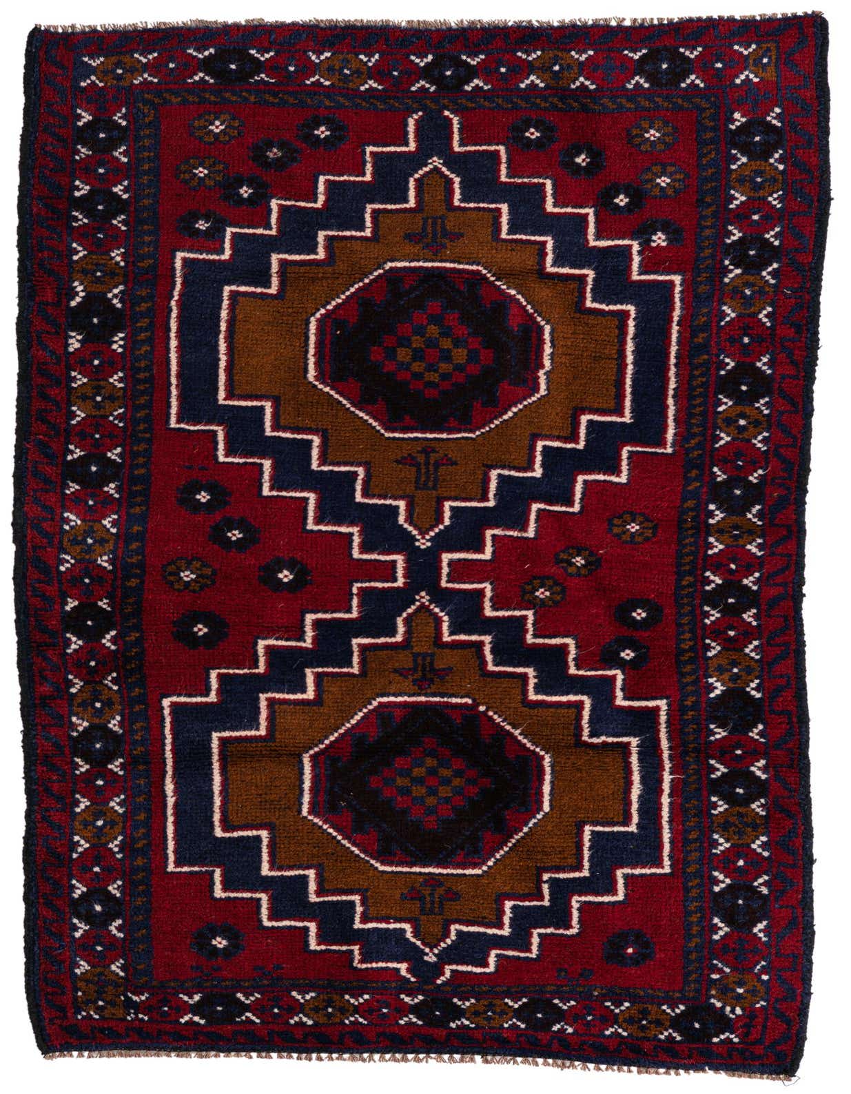 A 3x5 rectangular Balouch rug with a deep red field, featuring tribal geometric patterns in navy, brown, and white.