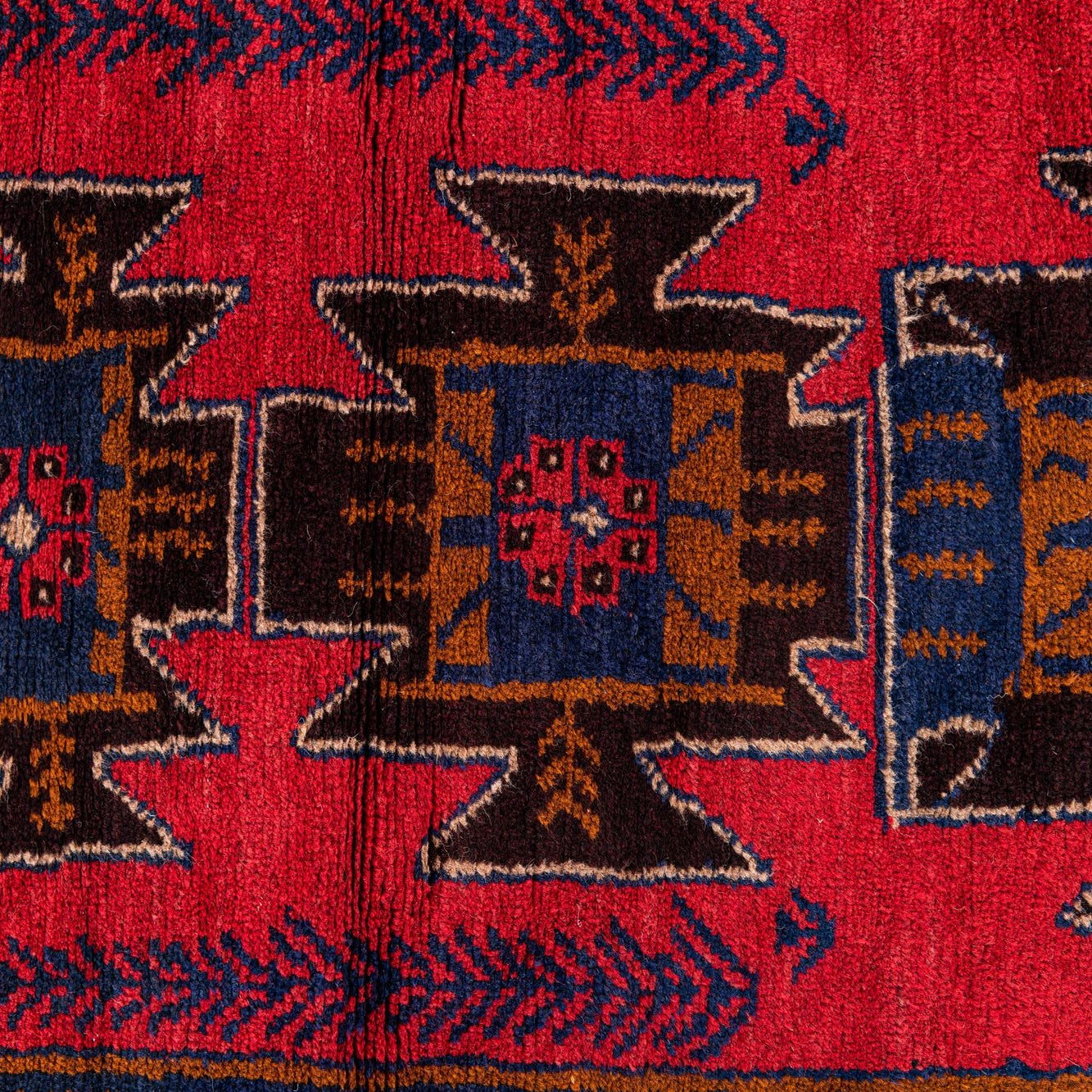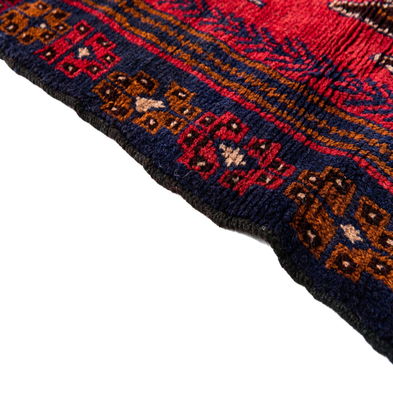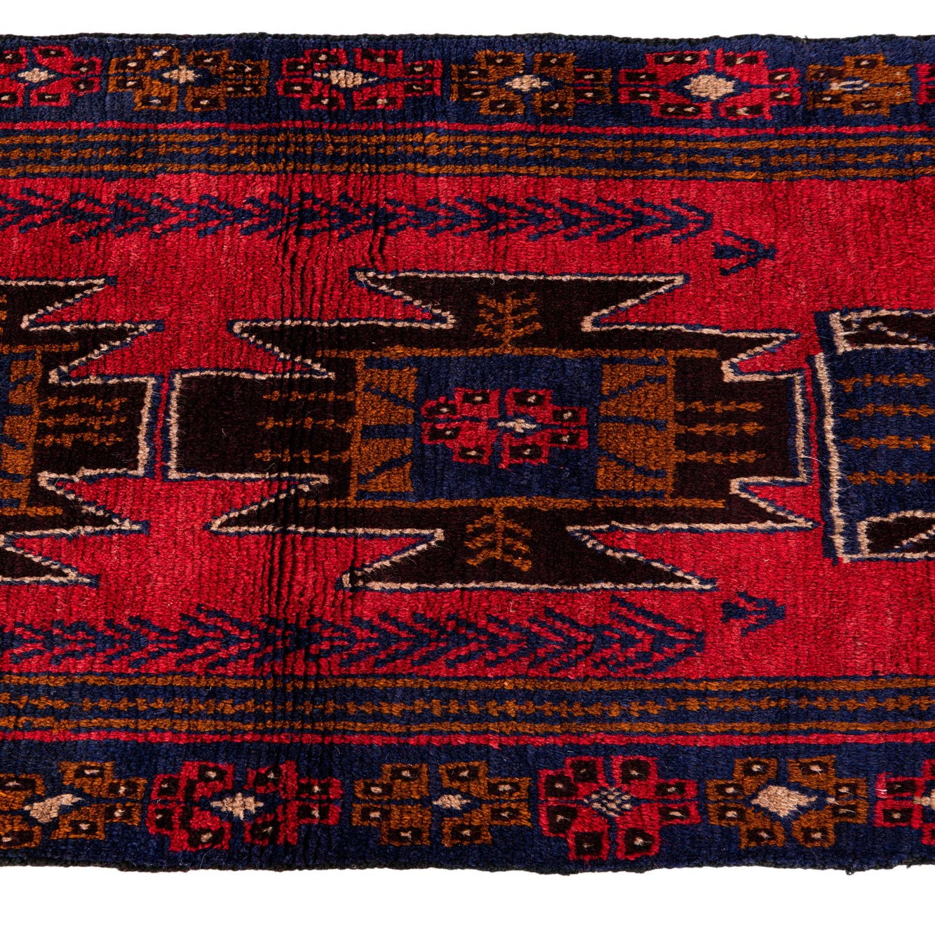 The Balouch collection features a hand-knotted area rug crafted from 100% wool, offering durability and a soft texture underfoot. This 3x5 piece showcases a rich Burgundy background accented by a compelling geometric pattern in hues of Brown, Red, Rust Red, and Navy Blue. The intricate design is framed by a traditional border, adding a sense of structure and refinement. The rug is finished with fringe, lending a classic touch.