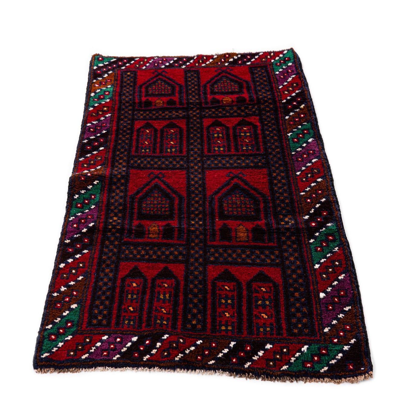 This Balouch collection rug is an authentic hand-knotted piece crafted from 100% wool, offering both durability and soft underfoot comfort. Measuring 3x5 feet, it is an adaptable size for a variety of spaces. The rug features a deep burgundy background that creates a warm and inviting base for the intricate array of patterns and symbols that adorn its surface. Accents in brown, green, ivory, red, rust red, terracotta, and navy blue interweave to create visually compelling geometric motifs, which are hallmarks of traditional Balouch designs.