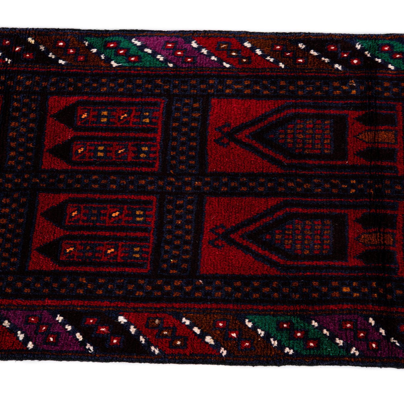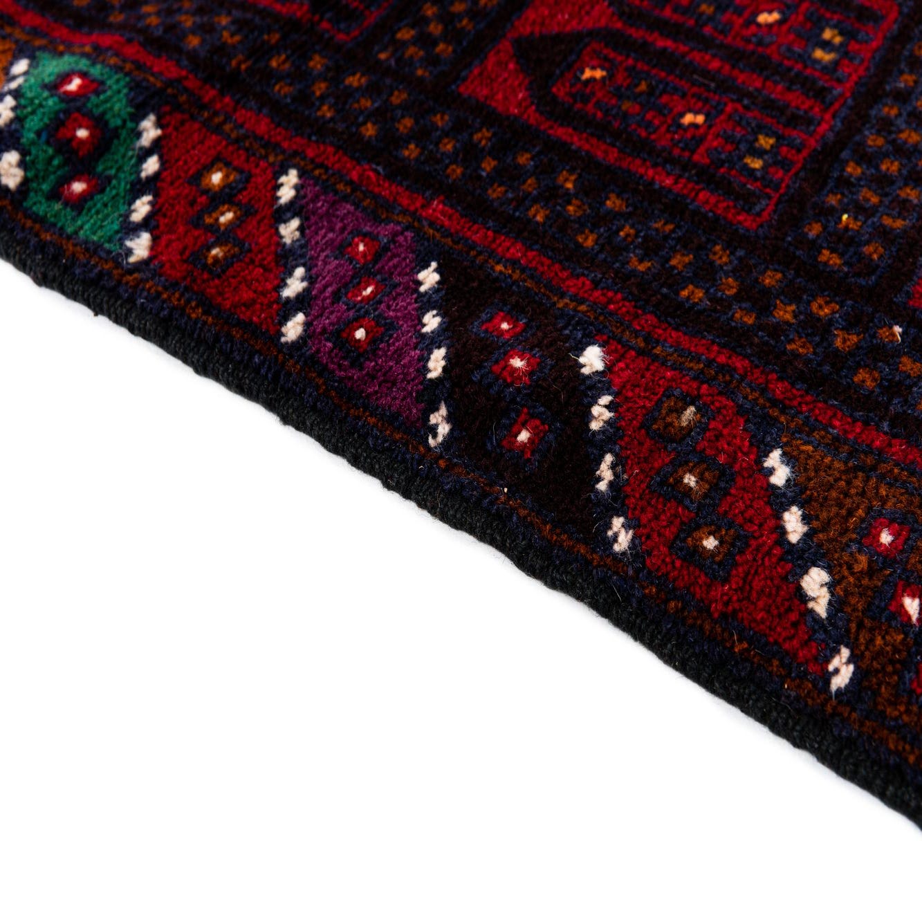 This Balouch rug would complement decor scenarios that draw on traditional, tribal, or eclectic aesthetics. It can serve as a statement piece in a minimalist setting or blend harmoniously with more richly adorned spaces. Its robust palette would work well with dark wood furnishings, leather accents, and rooms aiming for an intimate and grounded atmosphere. The handcrafted nature of this rug also makes it suitable as a centerpiece in living rooms, studies, or small dining areas where its artistry can be appreciated up close.