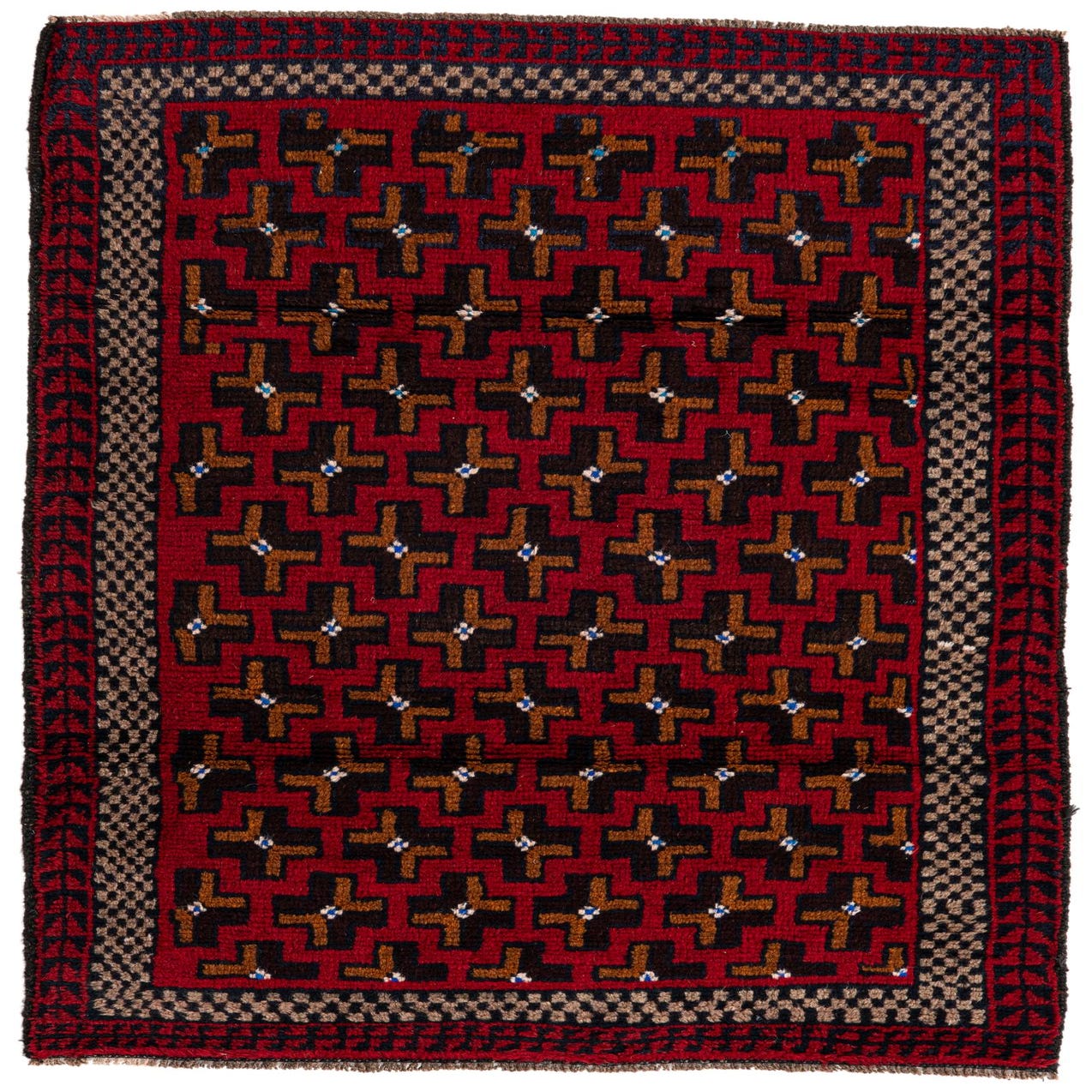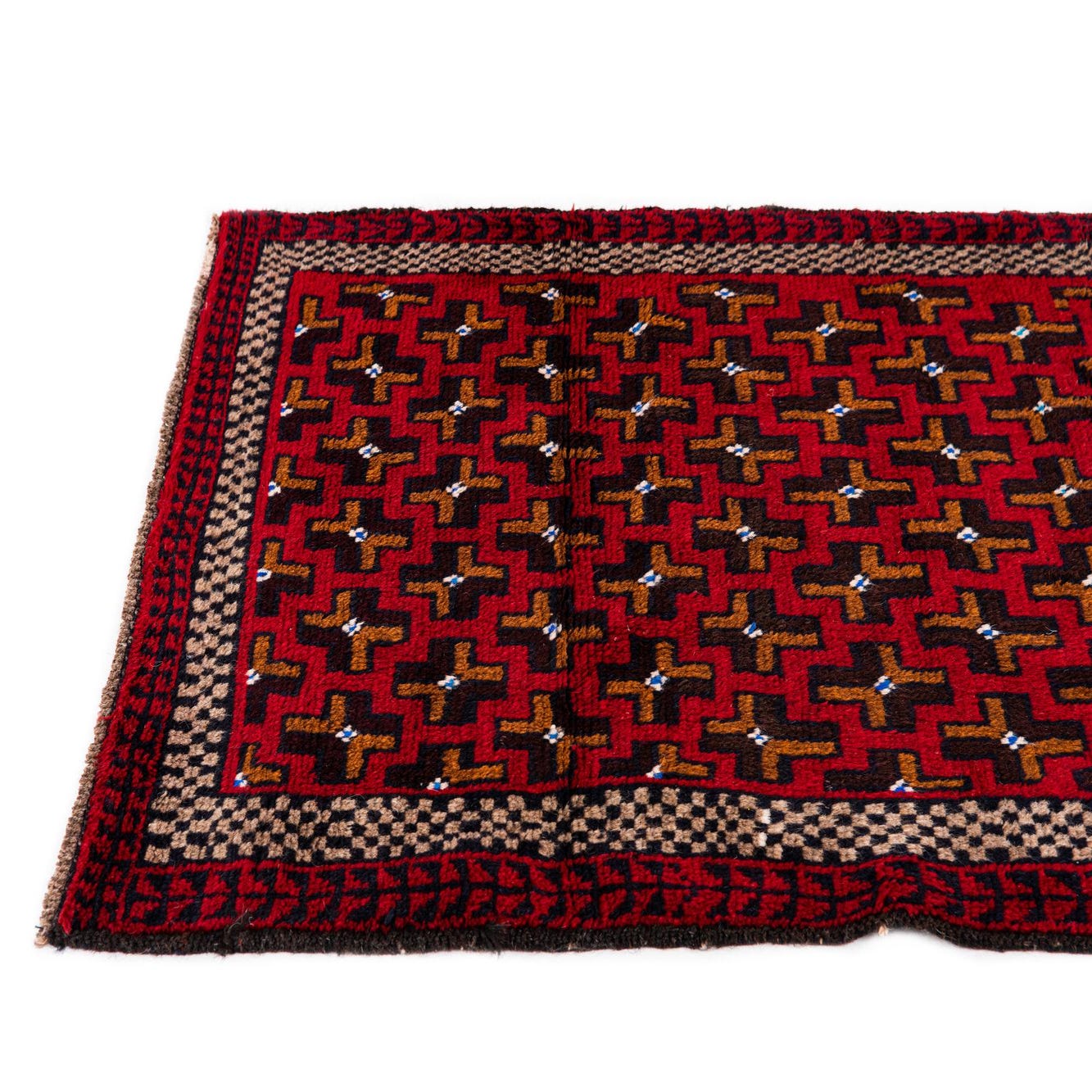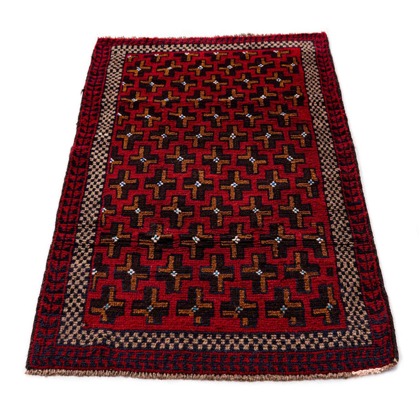 A 3x5 rectangular Balouch rug with a red field featuring repeating black and brown tribal cross patterns, bordered by checkerboard and geometric designs.