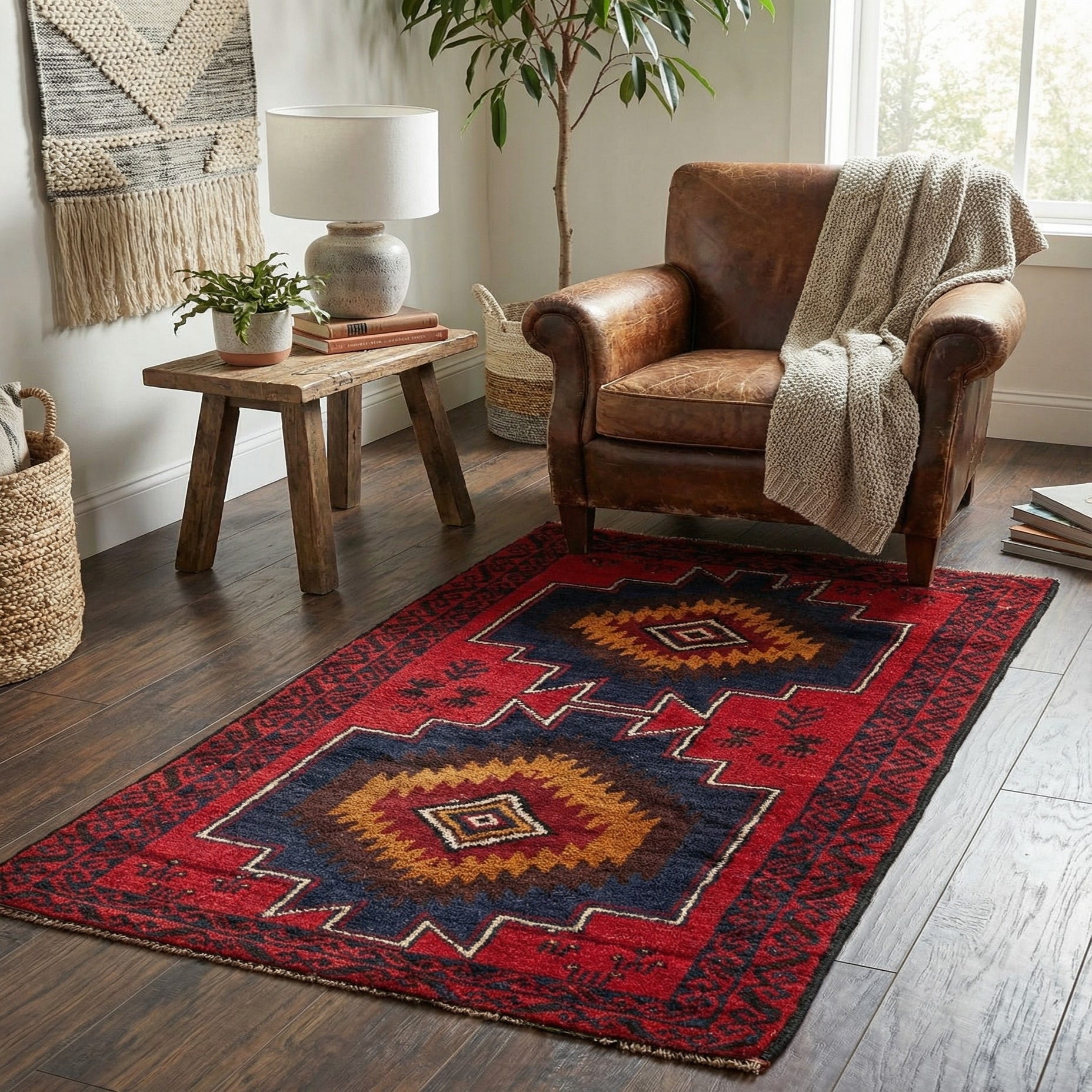 A 3x5 rectangular Balouch rug with a traditional tribal pattern in deep red, navy, and gold, featuring two central medallions.
