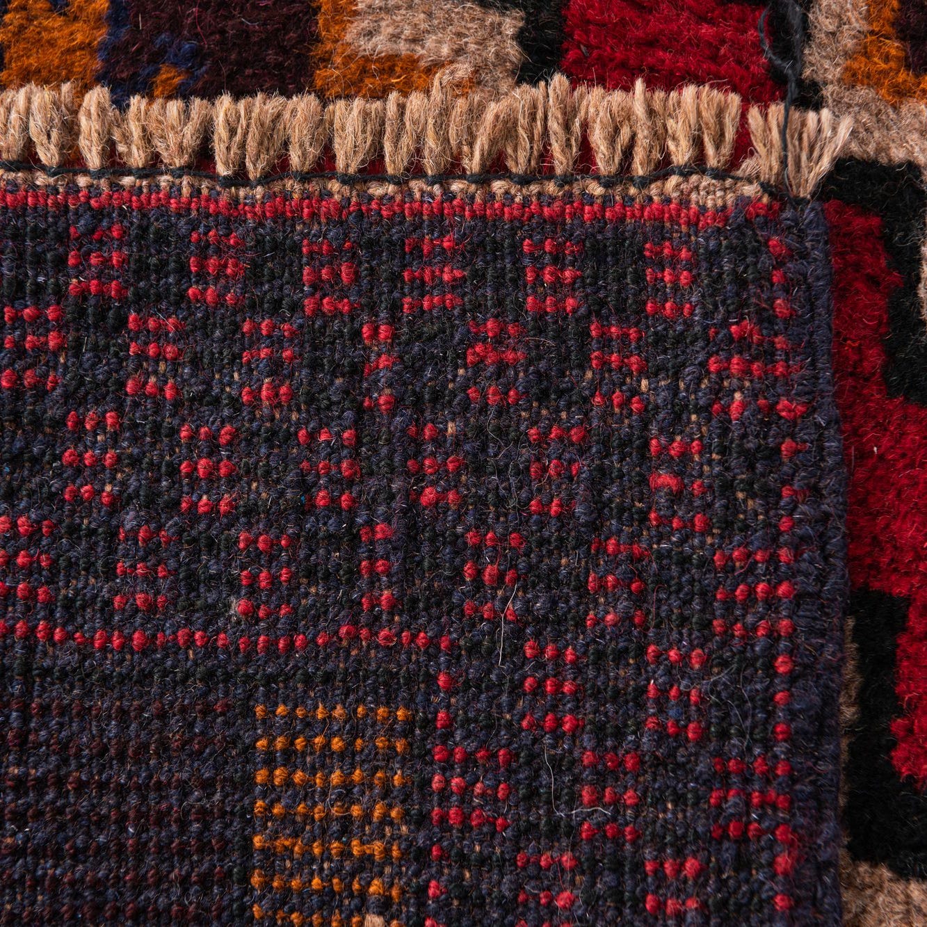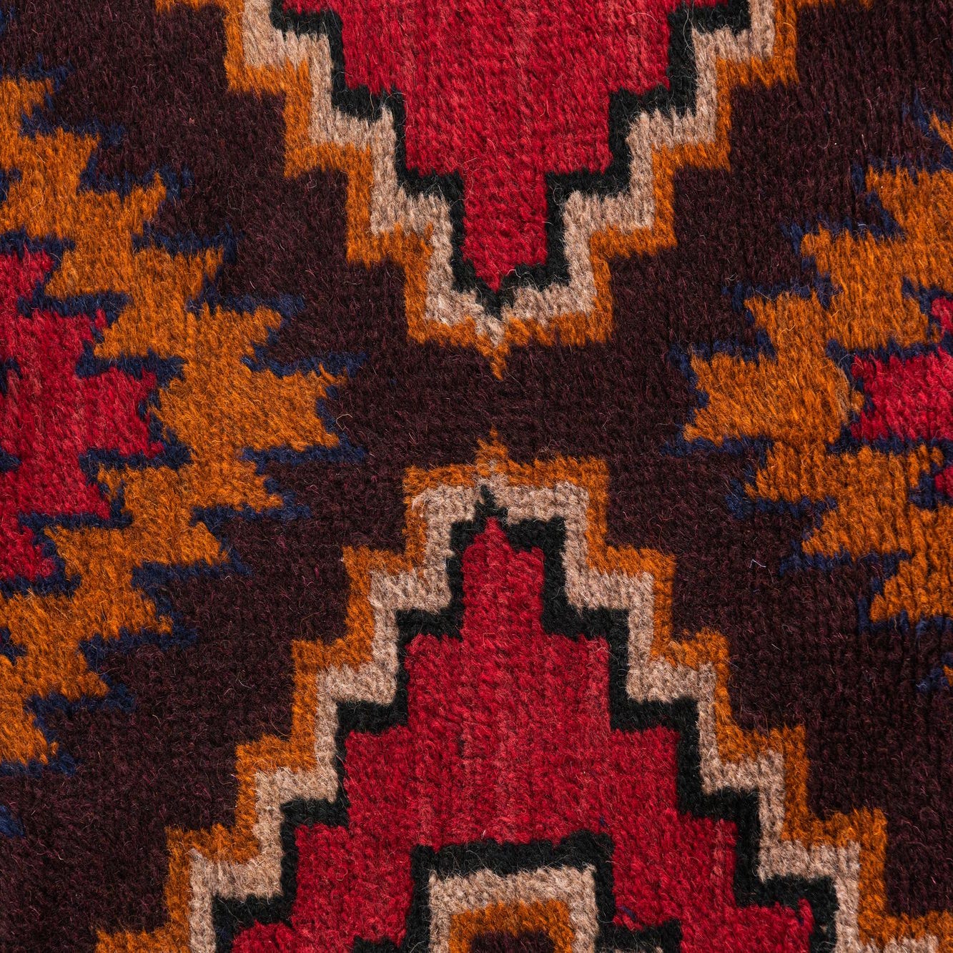 The Balouch collection presents a 3x5 hand-knotted rug crafted from 100% wool, showcasing a richly textured surface that adds depth and tactile appeal. The piece features a primarily burgundy background with complementary shades of navy blue, terracotta, and maroon that create a captivating color palette. As part of its traditional design, the rug exhibits bold geometric patterns and intricate motifs that are symmetrical and evoke a sense of balance and harmony.
