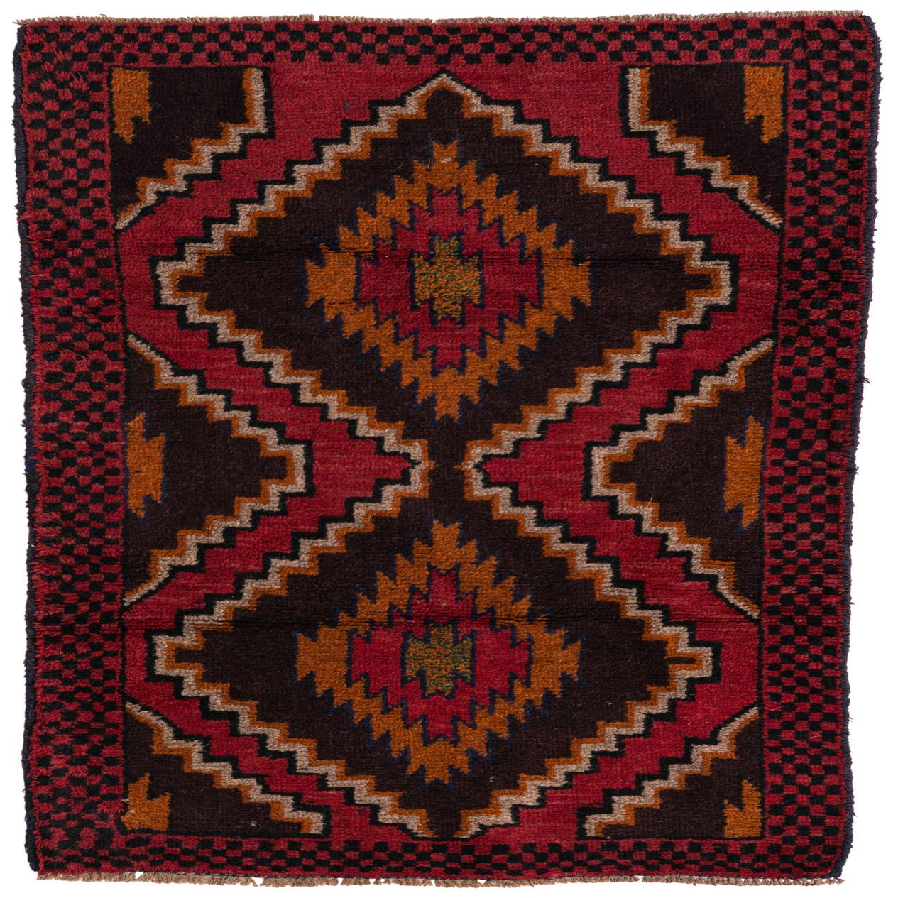 A 3x5 rectangular Balouch rug featuring a traditional tribal medallion pattern in deep reds, black, and orange tones.