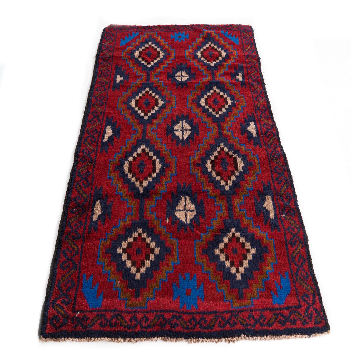 A 3x5 rectangular Balouch rug in deep red with traditional tribal patterns in navy blue, light blue, and beige.