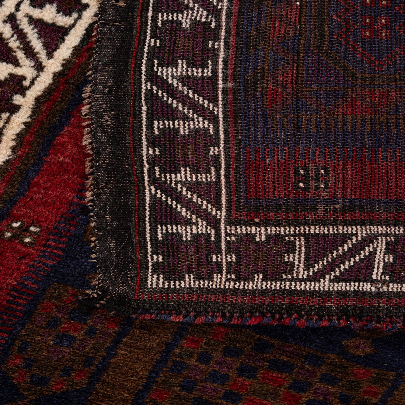 A 3x5 rectangular Balouch rug with a deep red field and navy blue, brown, and cream traditional Persian patterns, ideal for an entryway.