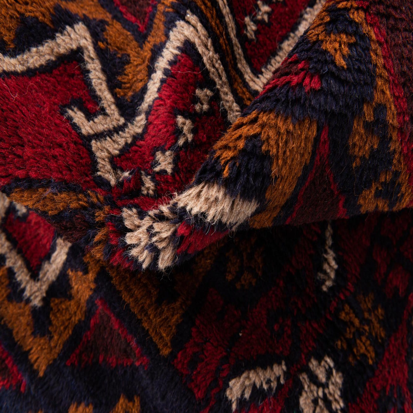 Primary color is Burgundy. Colors in this rug include: Burgundy, Navy Blue, Terracotta, Maroon, Ivory.