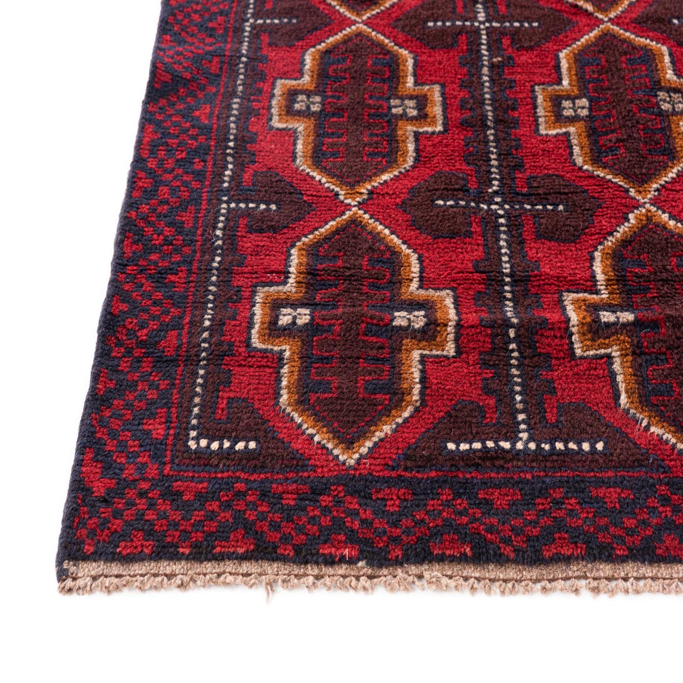 Primary color is Burgundy. Colors in this rug include: Burgundy, Beige, Brown, Maroon, Navy Blue.