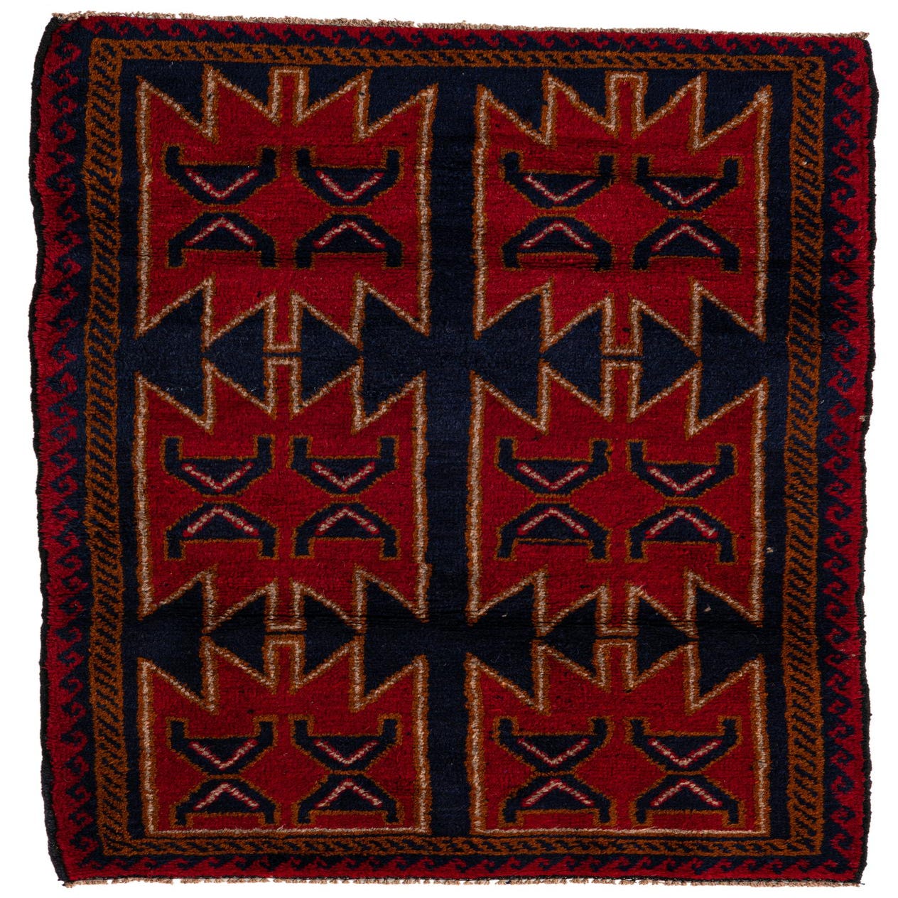 A 3x5 rectangular Balouch rug in deep red and navy blue with intricate tribal patterns and a thin pile, suitable for an entryway.