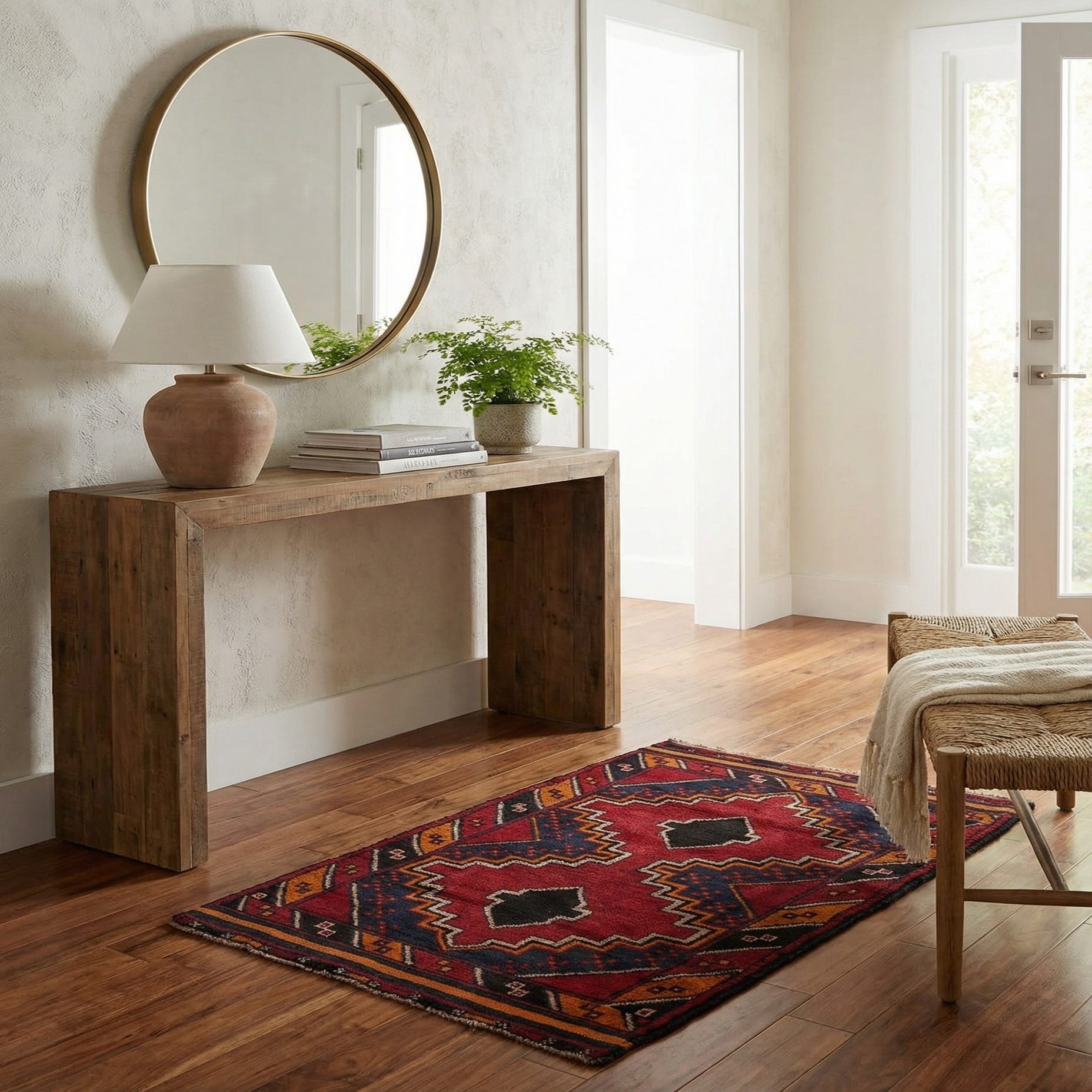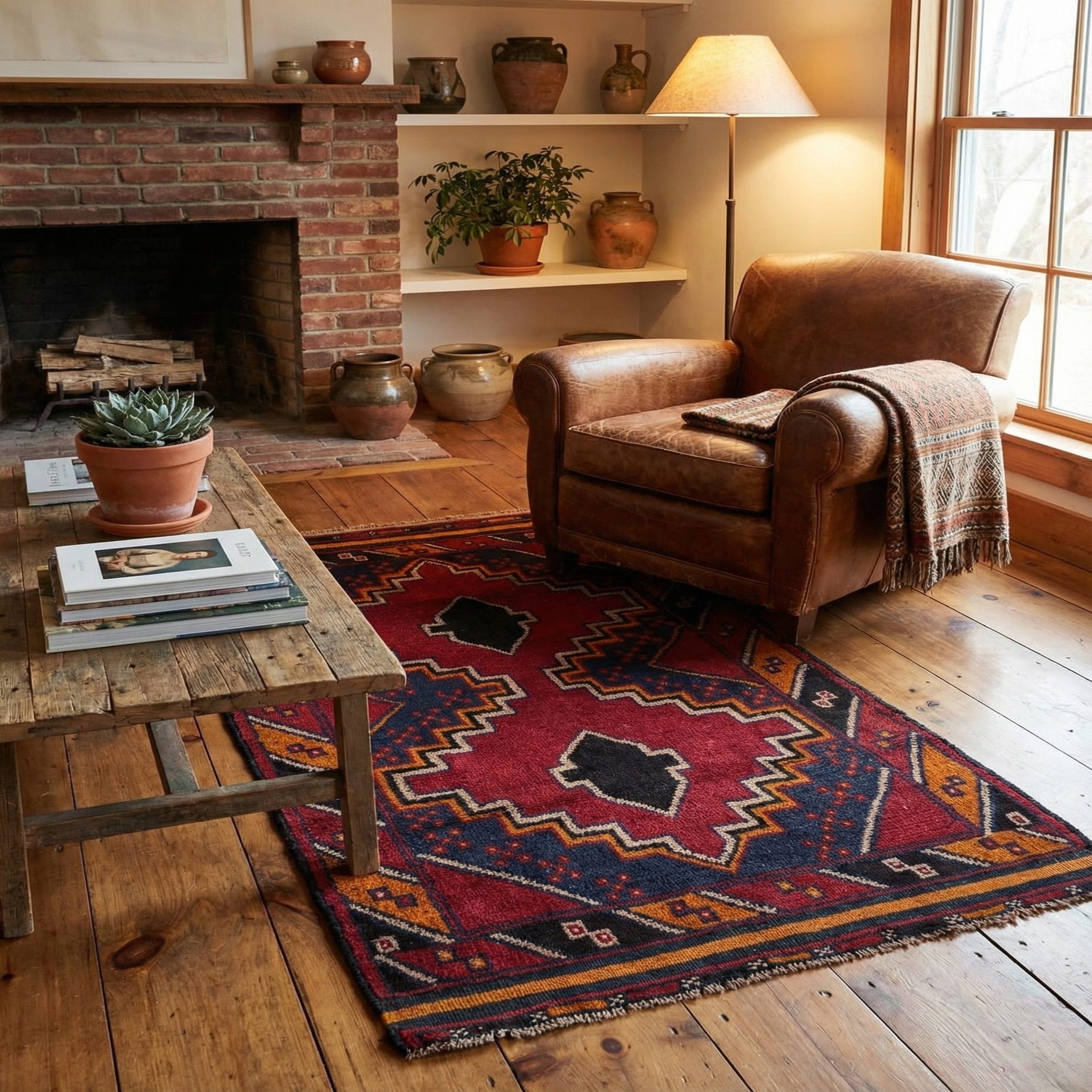 A 3x5 rectangular Balouch rug with a traditional tribal pattern in deep reds, navy blue, and gold, featuring a central medallion design.
